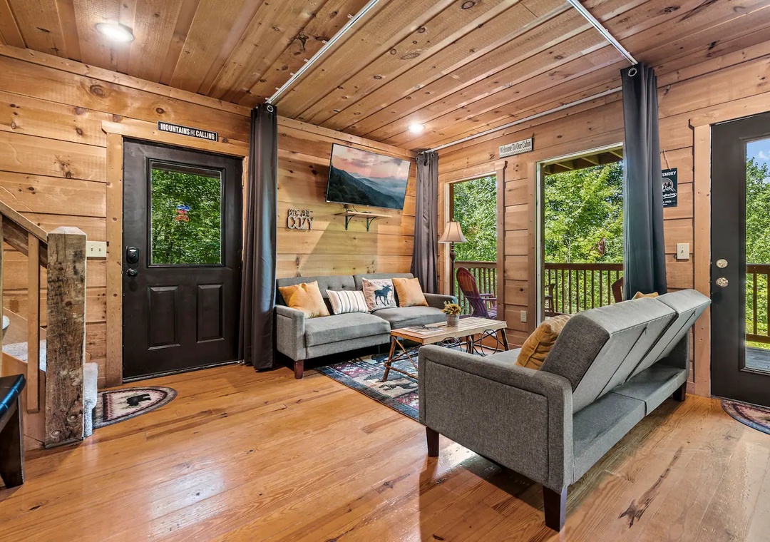 Justus, Thanks for the review and for choosing my cabin for your stay. I'm glad you enjoyed the peaceful surroundings and the outdoor spaces. I'll make sure to check on the sofa beds and see if there's anything I can do to make them more comfortable. Thanks again for staying and I hope to have you back for another visit soon!Smoky Mountain Holiday staff