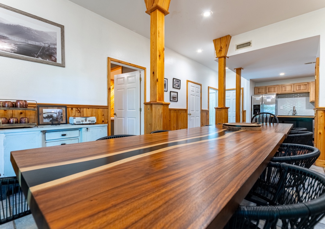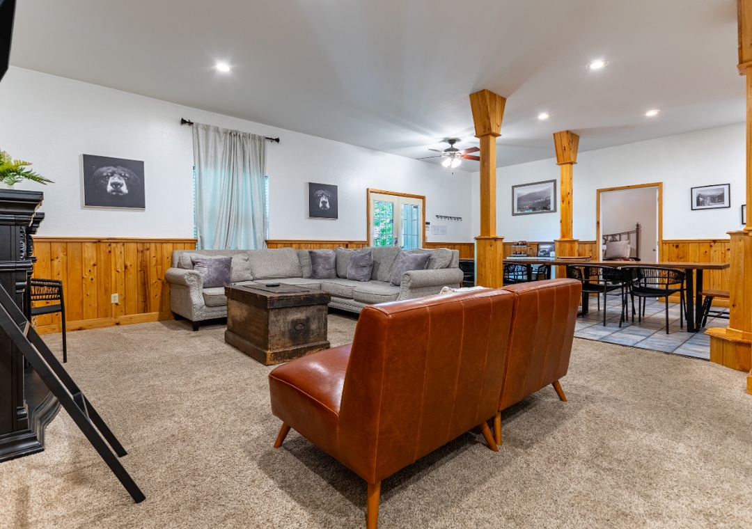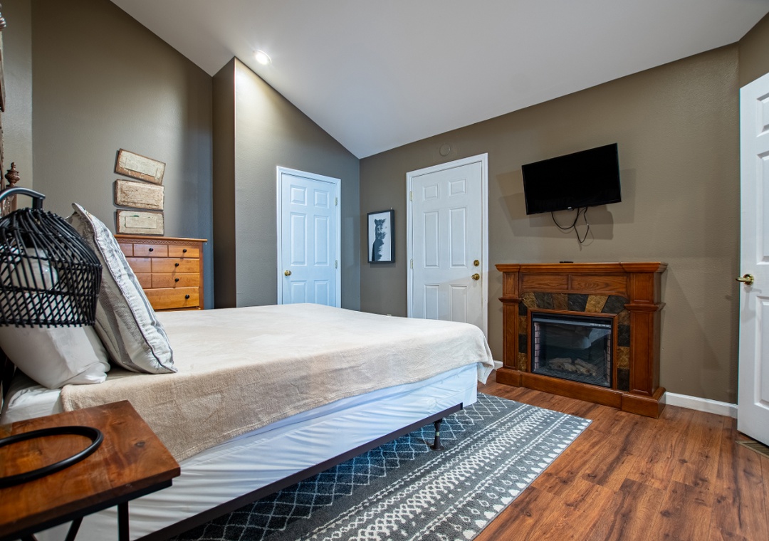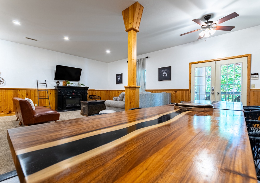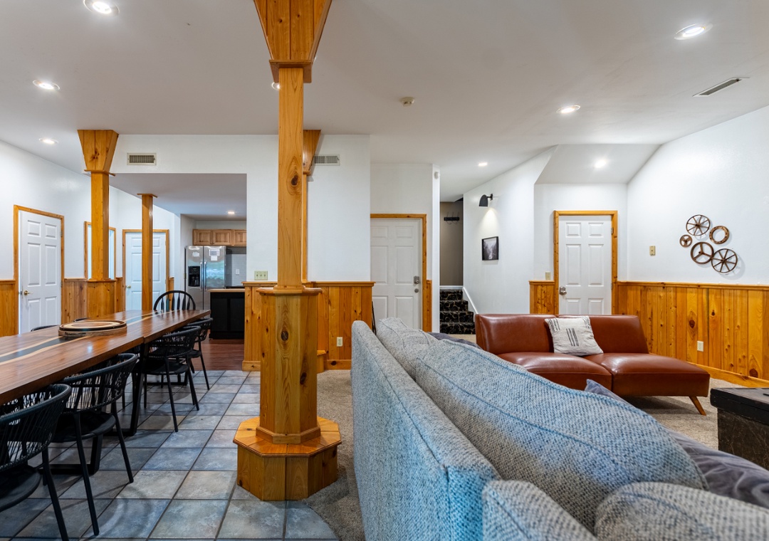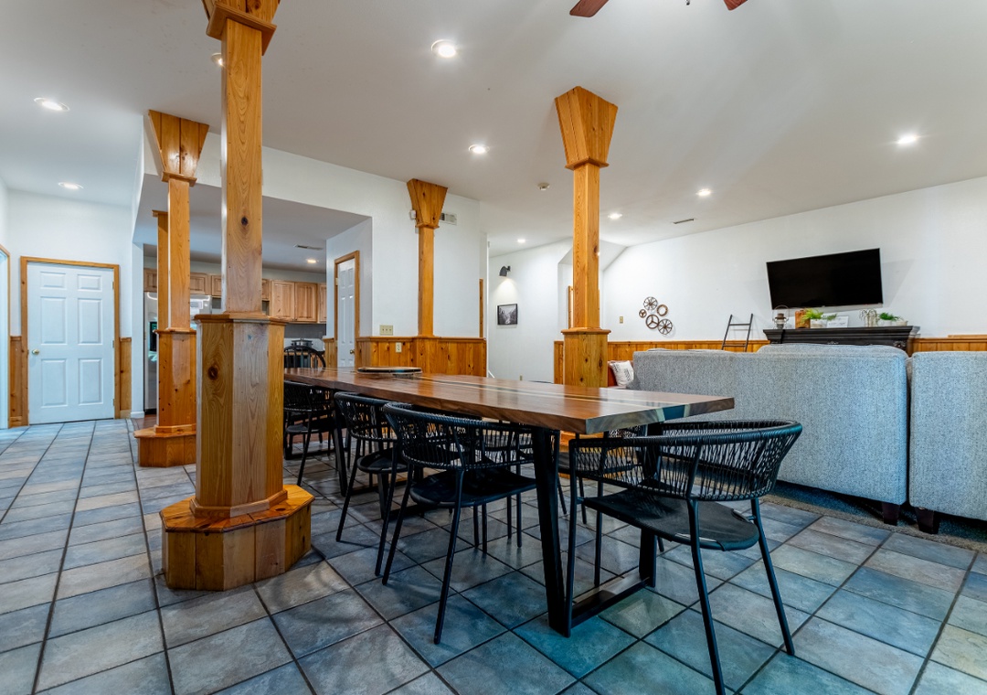 The heart of the indoor experience at Gatlinburg Mansion is its inviting main living area. The fireplace is the perfect centerpiece for the spacious living room, creating a cozy spot to gather with your group after a day of exploring. Adjacent to the living area, the fully equipped kitchen with modern appliances, allows you to prepare meals with ease. You’ll also find the lodge’s five well-appointed bedrooms that are designed with comfort in mind, offering ample space for relaxation and privacy. Free WiFi is also available throughout the property.