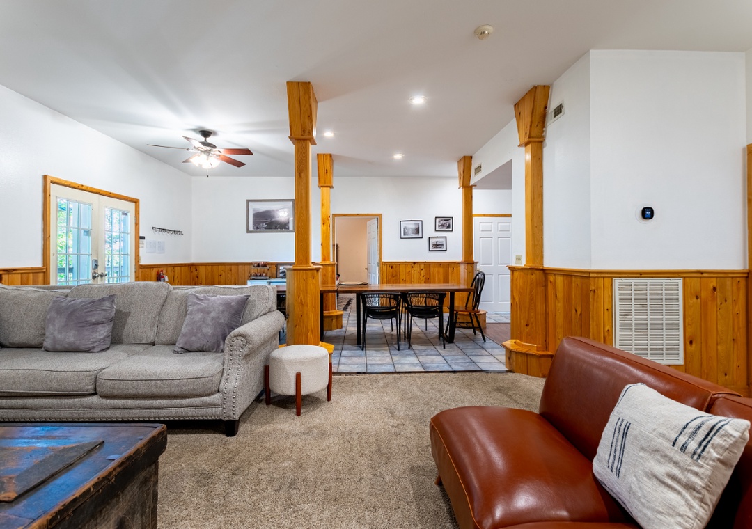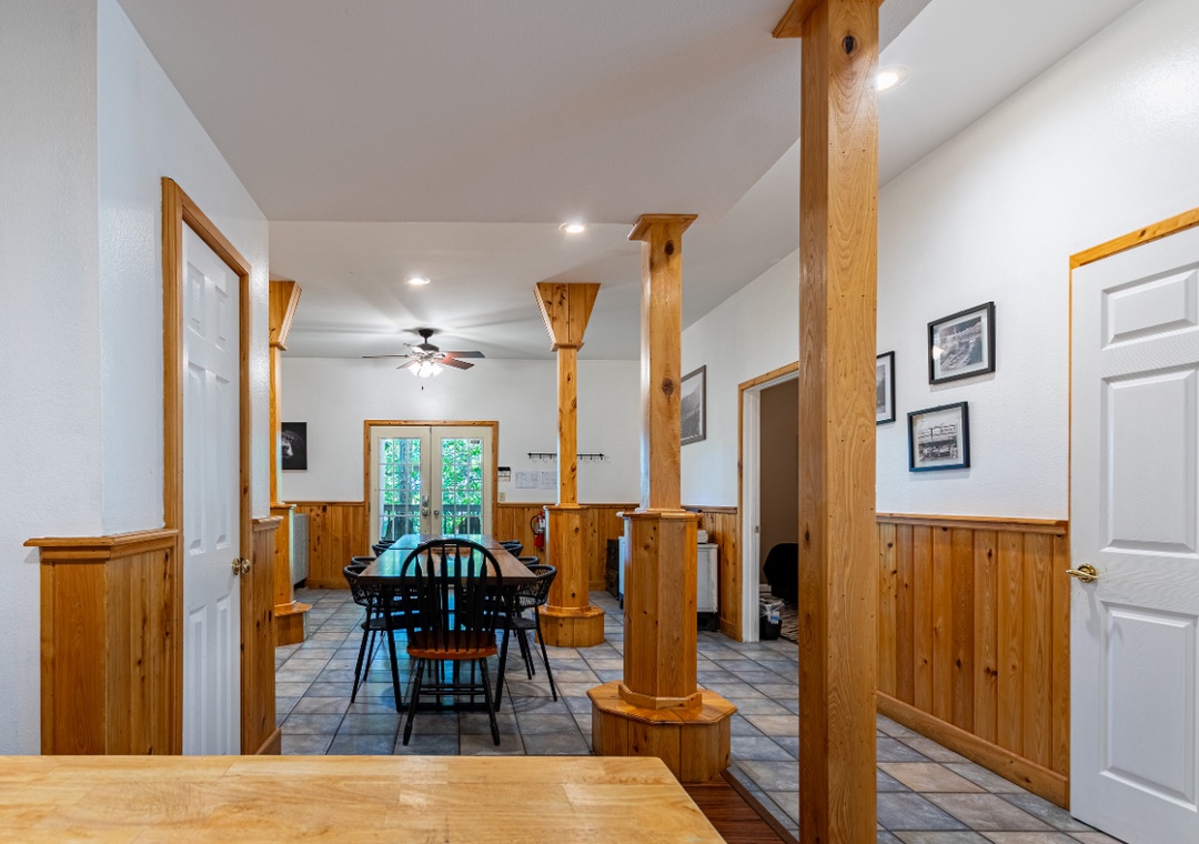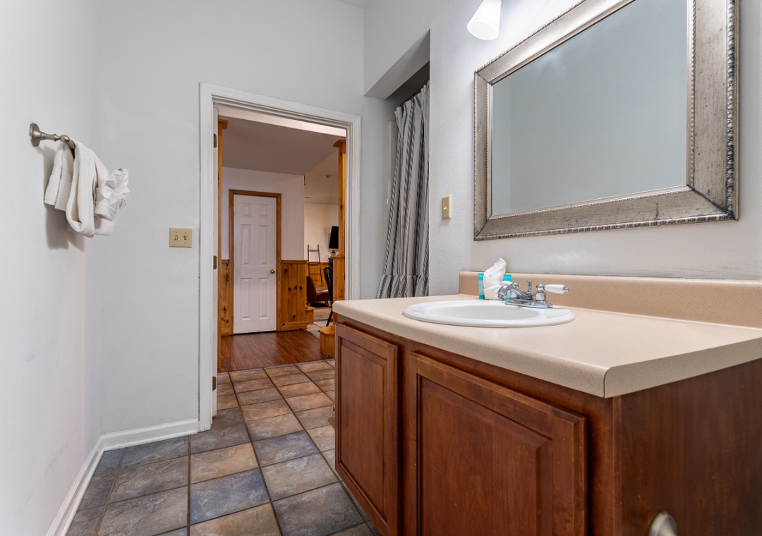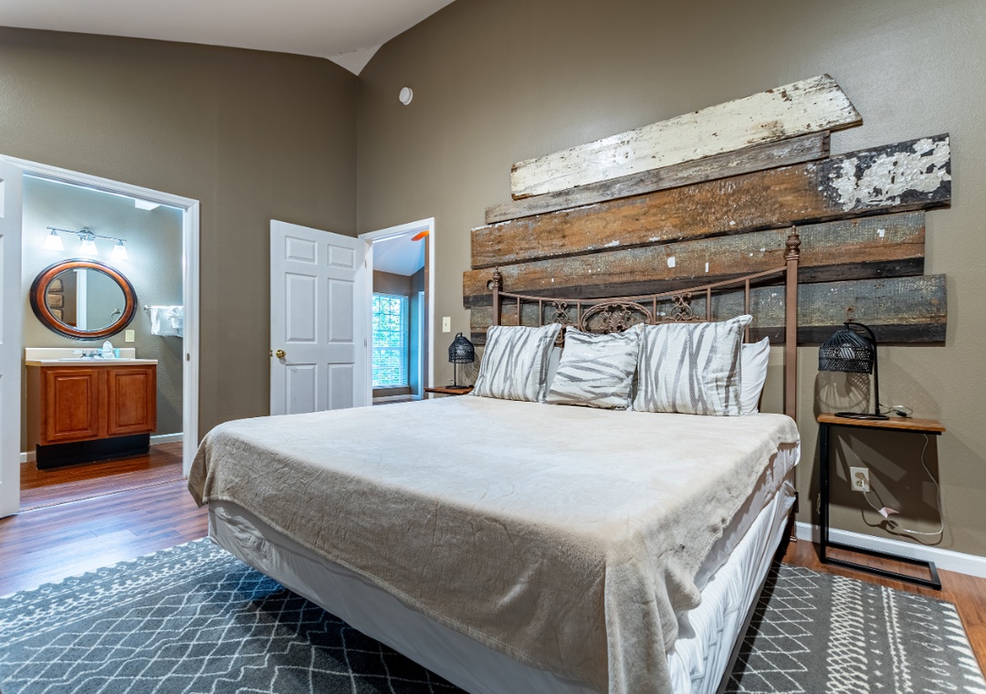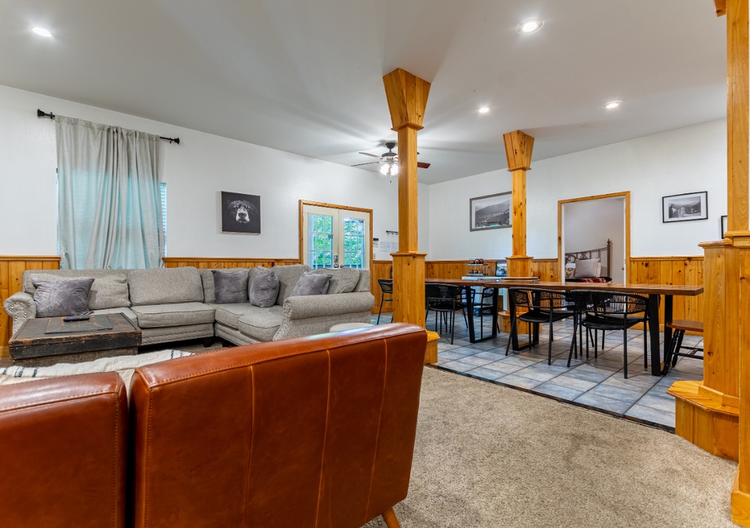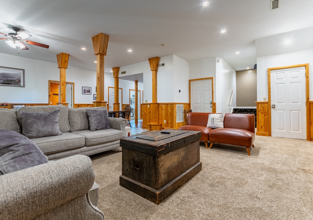 The heart of the indoor experience at Gatlinburg Mansion is its inviting main living area. The fireplace is the perfect centerpiece for the spacious living room, creating a cozy spot to gather with your group after a day of exploring. Adjacent to the living area, the fully equipped kitchen with modern appliances, allows you to prepare meals with ease. You’ll also find the lodge’s five well-appointed bedrooms that are designed with comfort in mind, offering ample space for relaxation and privacy. Free WiFi is also available throughout the property.