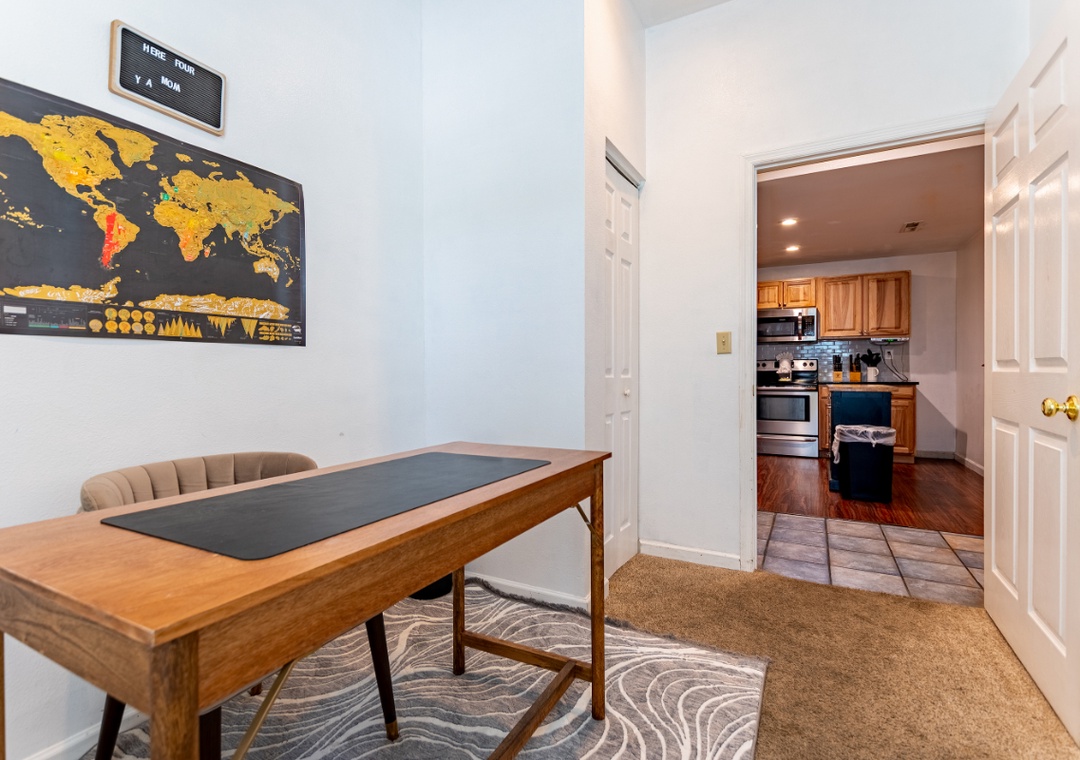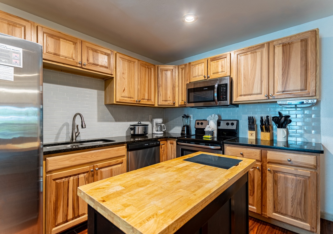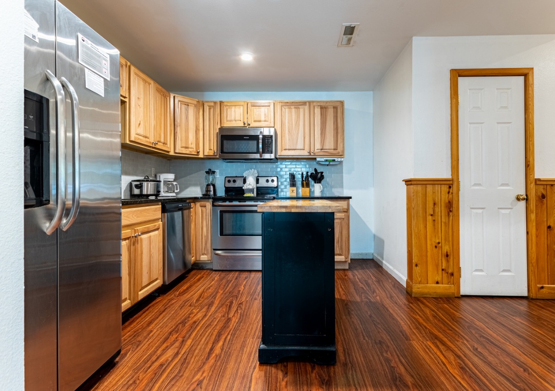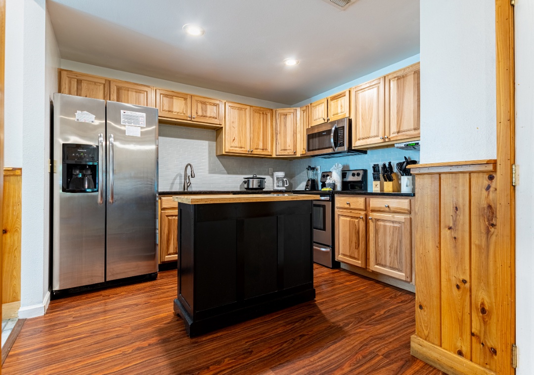 The fully equipped kitchen, adorned with granite countertops and stainless steel appliances, is a culinary haven. Well-appointed with a full-sized refrigerator, dishwasher, stove, microwave, and other kitchen appliances perfect for making breakfast, lunch, or dinner throughout your stay! All pots, pans, glasses, plates, silverware, etc. are also there for you! The classy wooden dining table offers a picturesque setting for enjoying meals with loved ones.