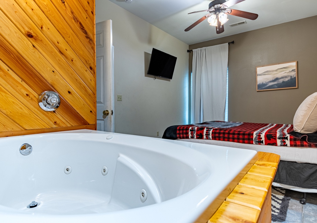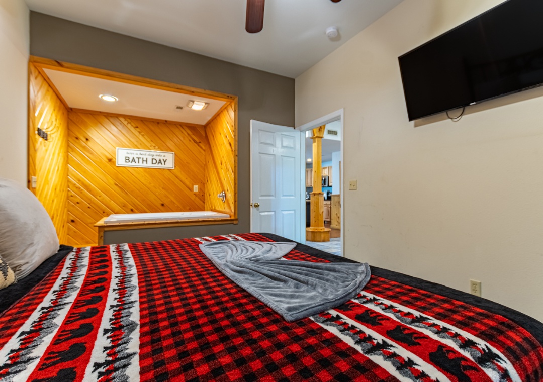 ✔ Bedroom #1 (Main Level): Spacious Bedroom with a King-sized Bed, Jacuzzi and Flat screen TV; Access to a Full Bathroom with Stand Up Shower