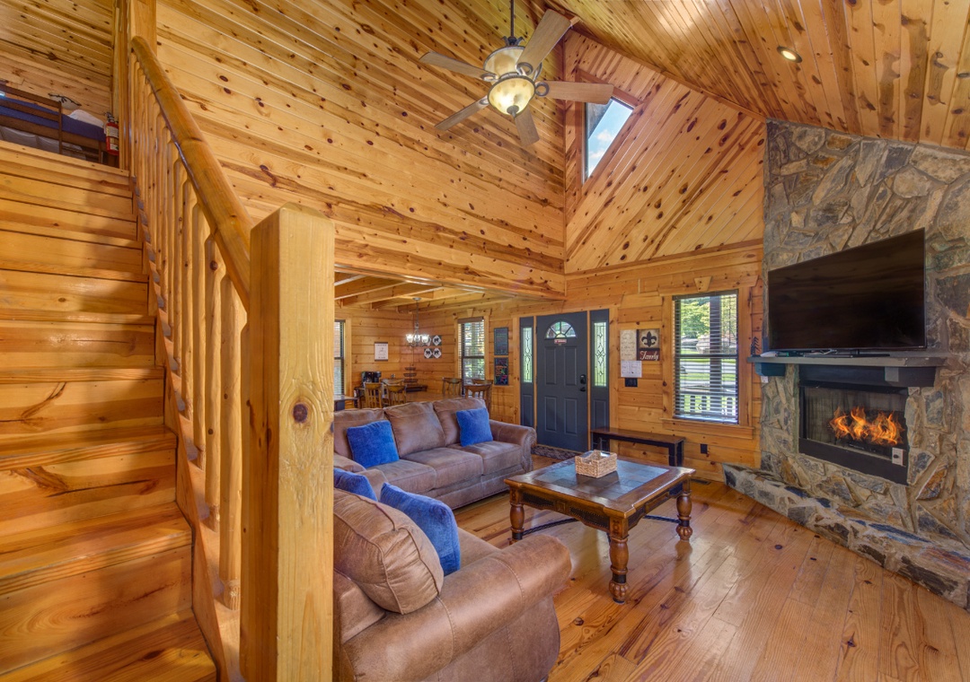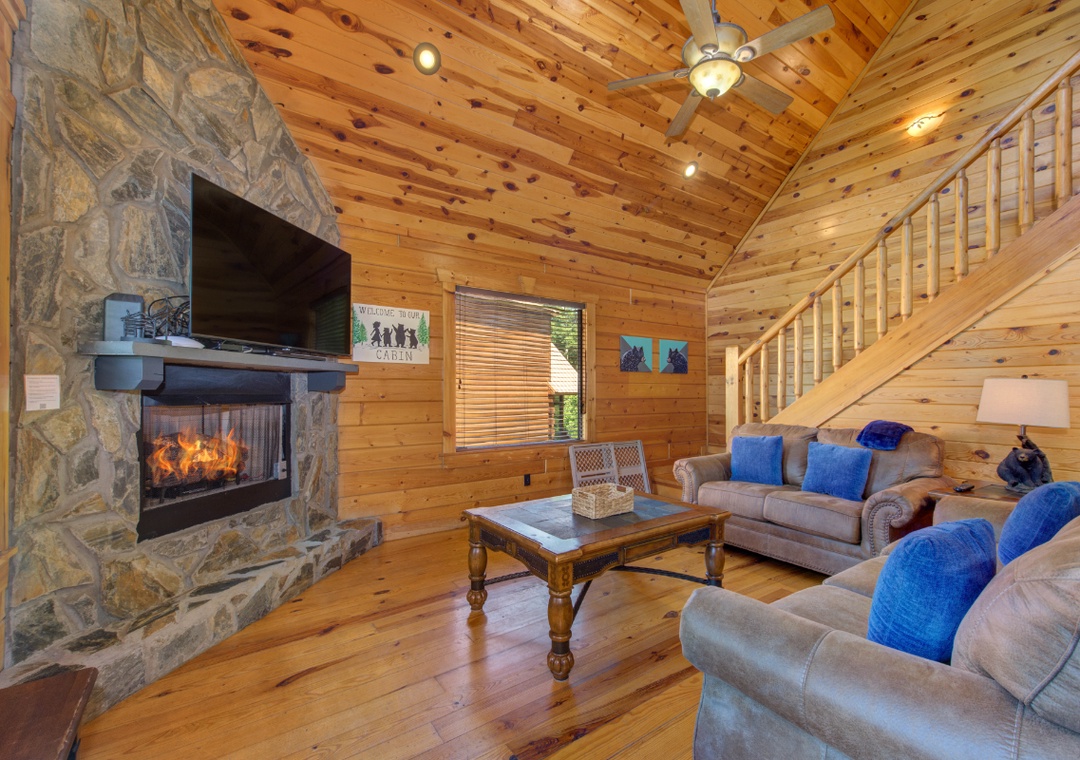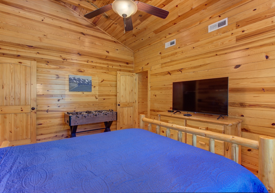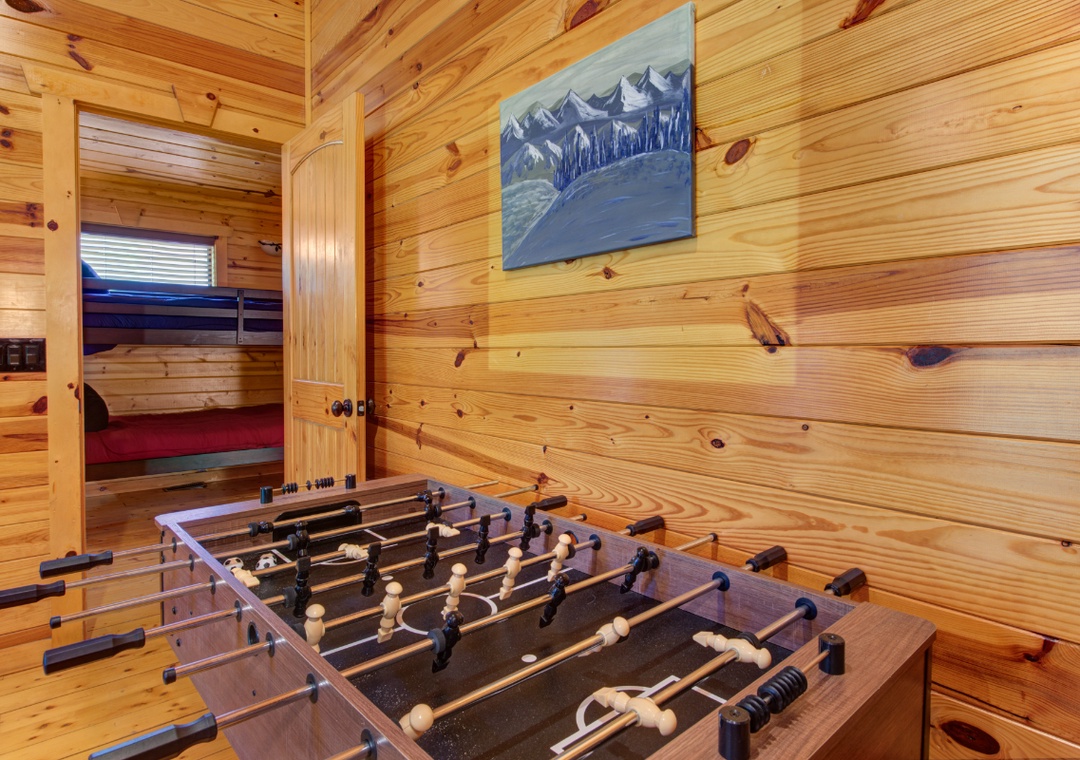 Start in the spacious living room and unwind in front of the cozy propane fireplace while streaming your favorite shows or movies on the massive 58" Roku TV. For some friendly competition, head up to the loft, where a full-size foosball table awaits. It's a great hangout space for kids and adults alike, offering hours of indoor fun. When it's time to relax, step out onto the screened-in back porch and soak in the bubbling hot tub, surrounded by the peaceful sounds of nature. It's the perfect spot to unwind after a day of hiking, sightseeing, or hitting the nearby shops and attractions. During warmer months, guests also have access to the seasonal community pool located at the entrance of the resort. It’s a great way to cool off on a sunny afternoon or spend a laid-back day swimming and lounging with the family. And when you're ready to venture out, you'll find no shortage of entertainment nearby. The cabin is just minutes from downtown Gatlinburg, with its vibrant mix of attractions, restaurants, shops, and live entertainment. You’re also close to Bent Creek Golf Course, local hiking trails, and the famous Arts and Crafts Community so you’re never far from something fun to do.