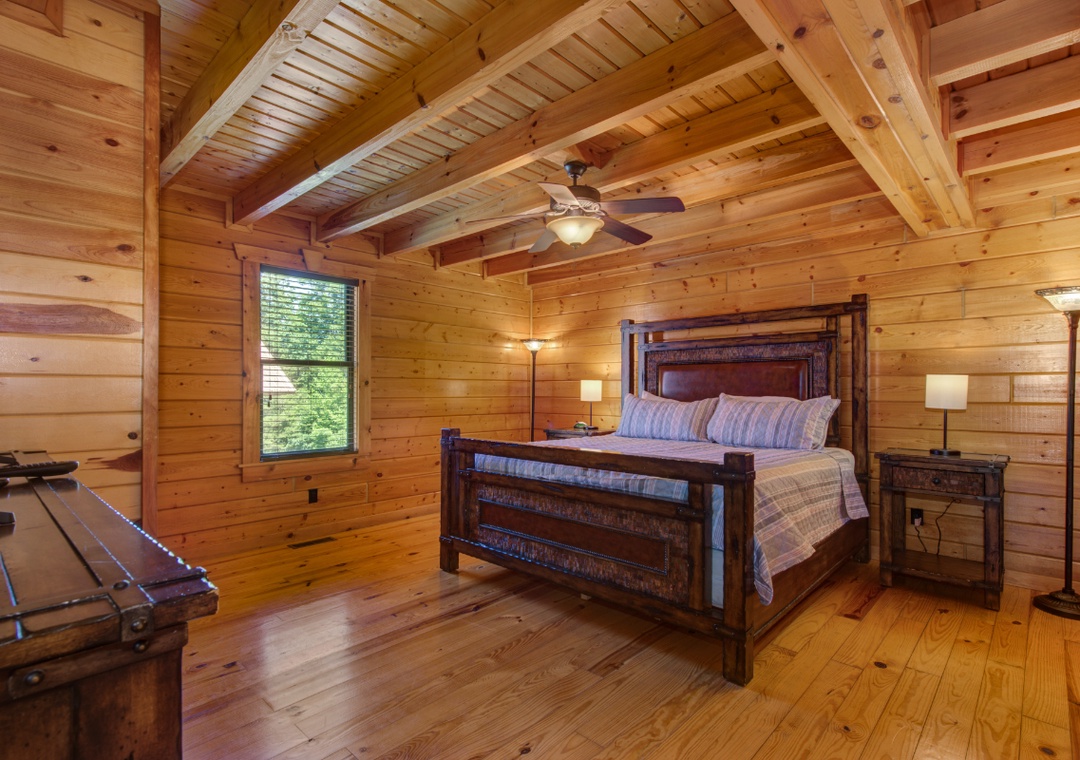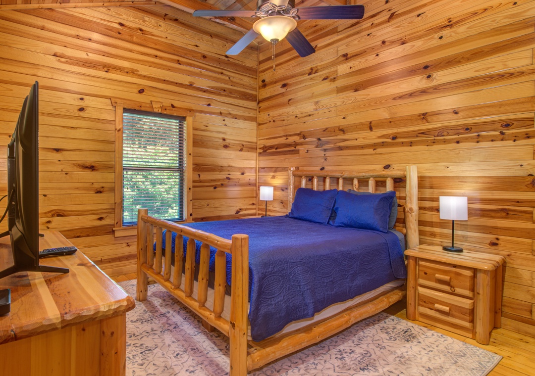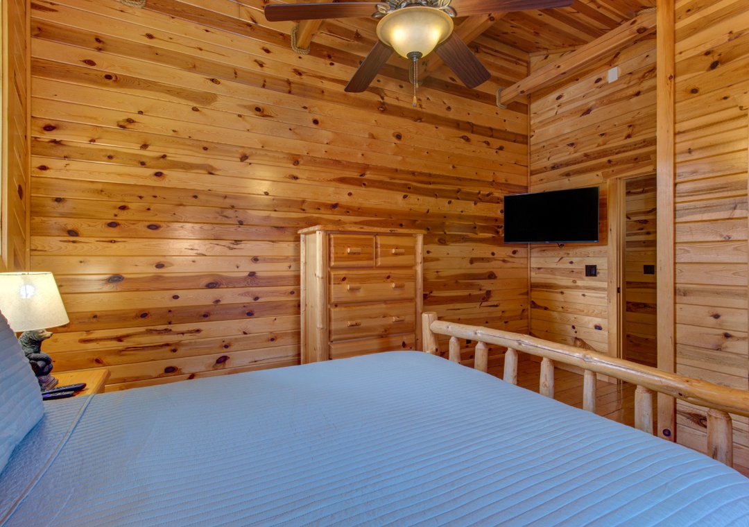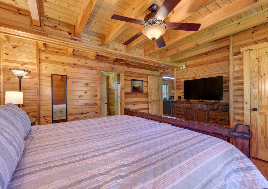✔ Bedroom #1 (Main Level): Spacious Bedroom with a King-sized Bed and a Flat-screen TV; Access to a Full Bathroom with Stand Up Shower