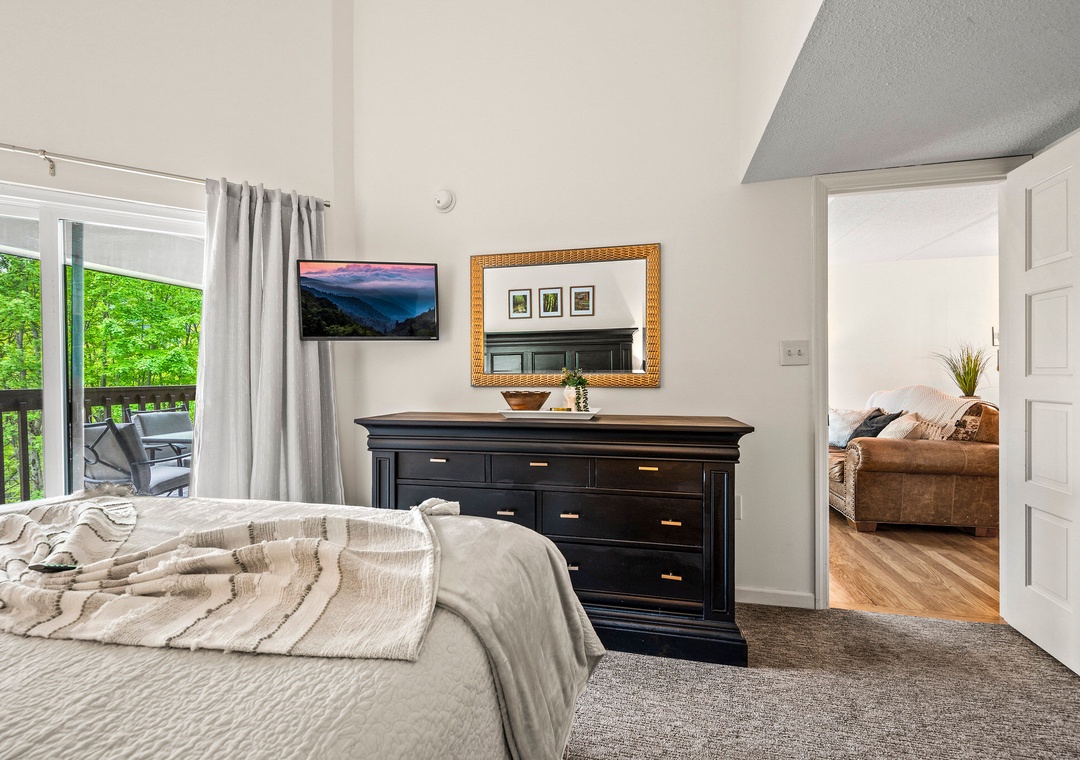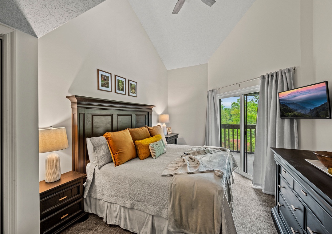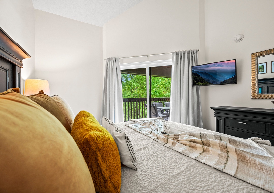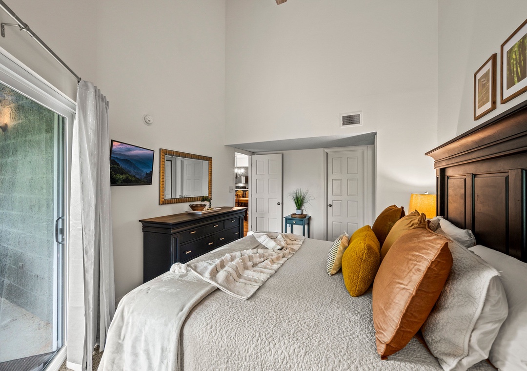 ✔ Bedroom #2 (Main Level): Spacious King Bedroom with Flat-screen TV; Attached Full Bathroom with Shower/Tub Combo