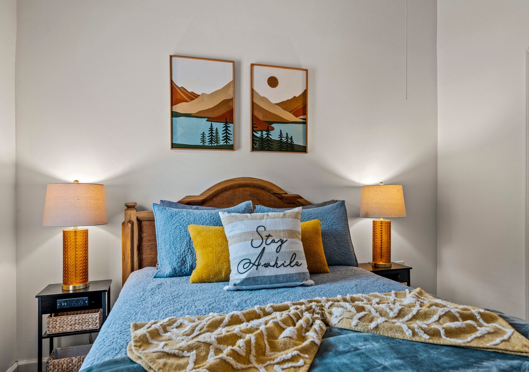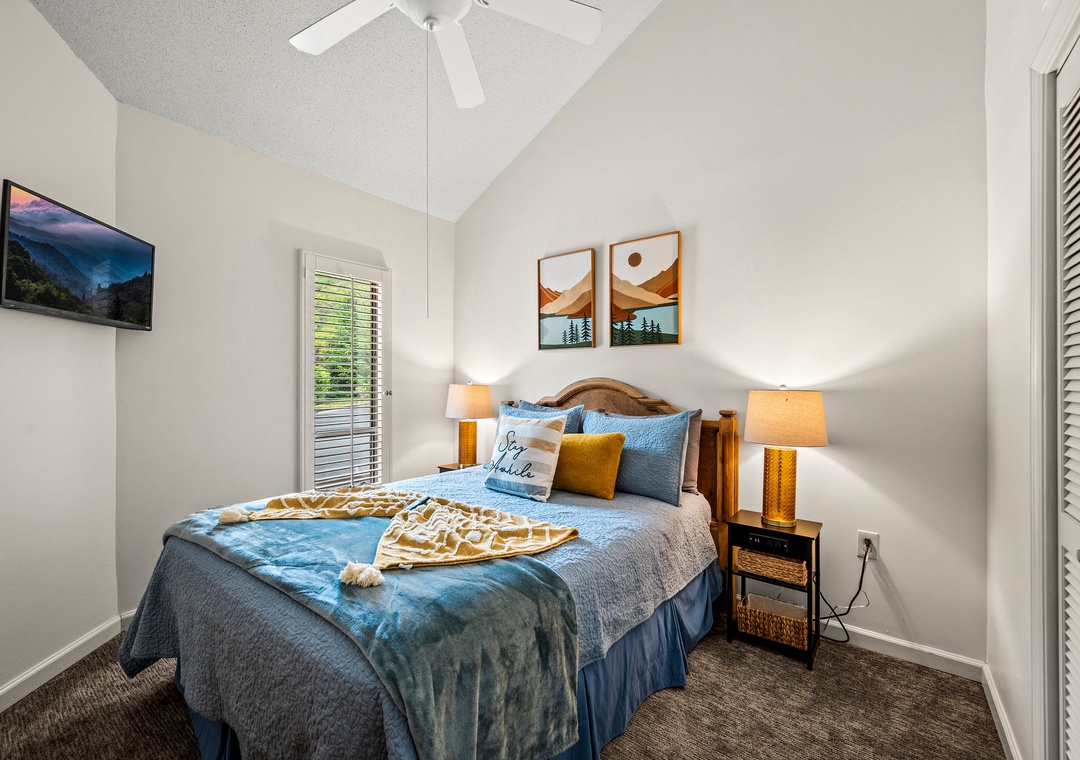 ✔ Bedroom #1 (Main Level): Comfy Queen Bedroom with Flat-screen TV; Access to Hallway Full Bathroom with Shower/Tub Combo