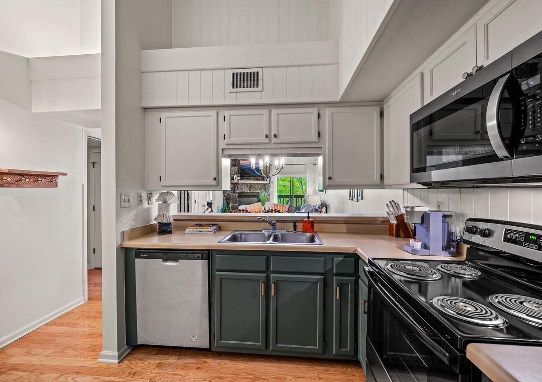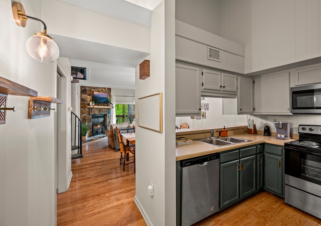 "Gracious Oasis" features a fully equipped kitchen, offering modern appliances and ample space for preparing delicious meals. Well-appointed with a full-sized refrigerator, dishwasher, stove, microwave, and other kitchen appliances perfect for making breakfast, lunch, or dinner throughout your stay! All pots, pans, glasses, plates, silverware, etc. are also there for you! Enjoy your culinary creations at the lovely breakfast bar, where you can savor your dishes while basking in the natural light or take your meals al fresco on the spacious, roofed deck, where you can dine amidst the fresh mountain air.