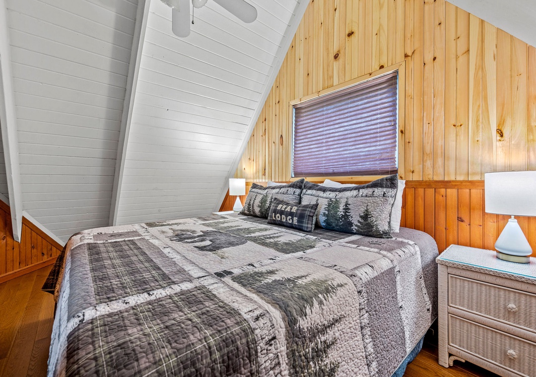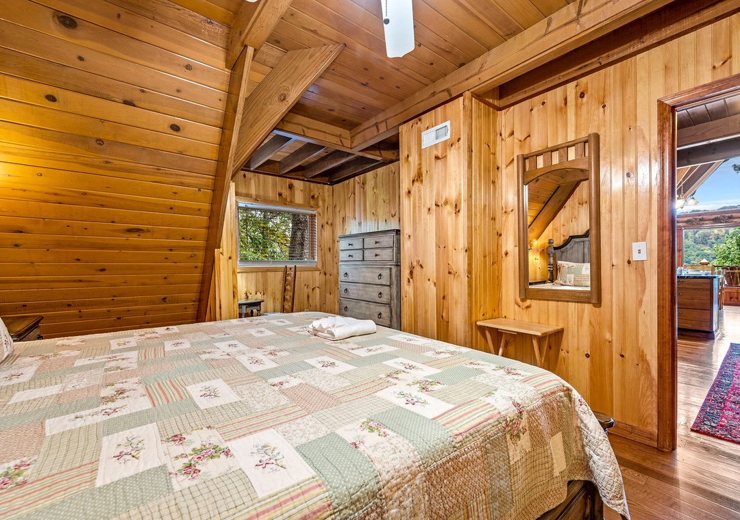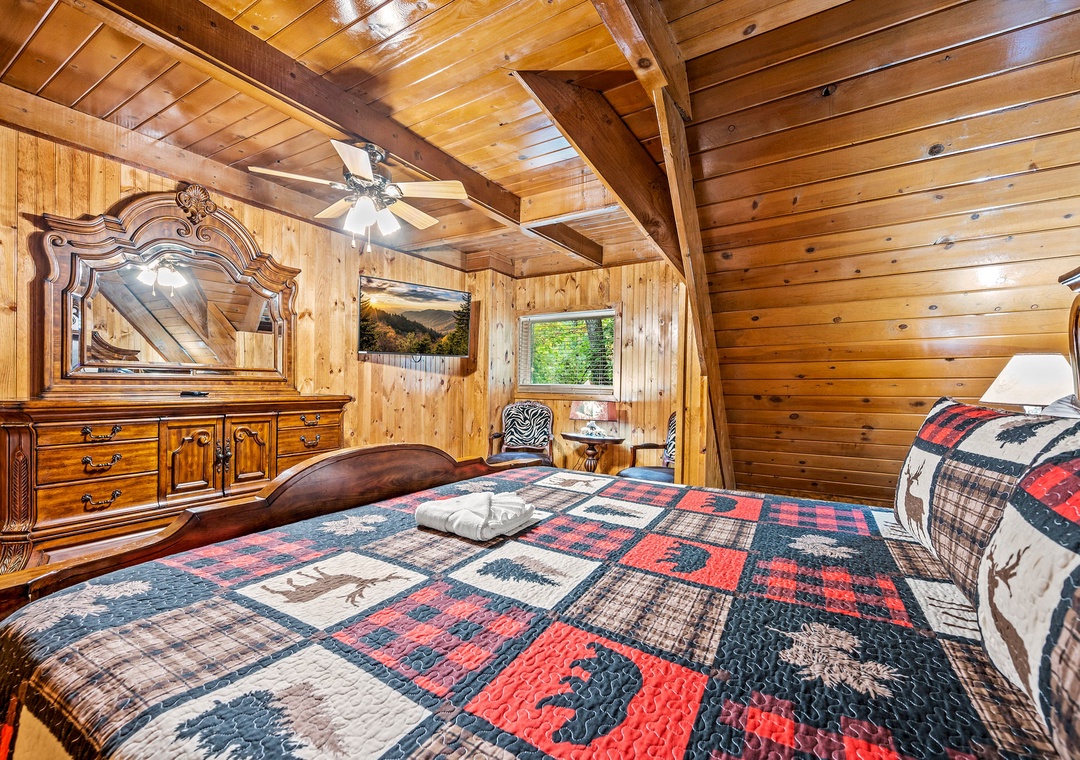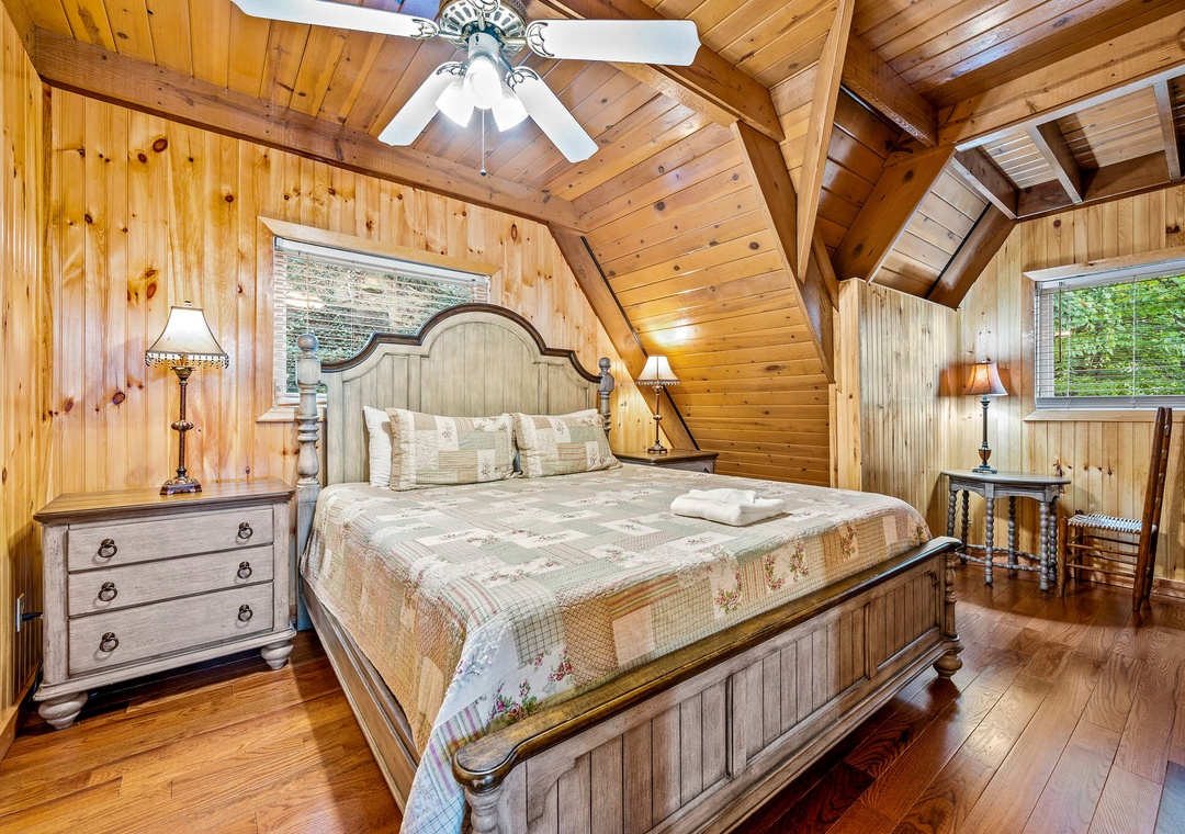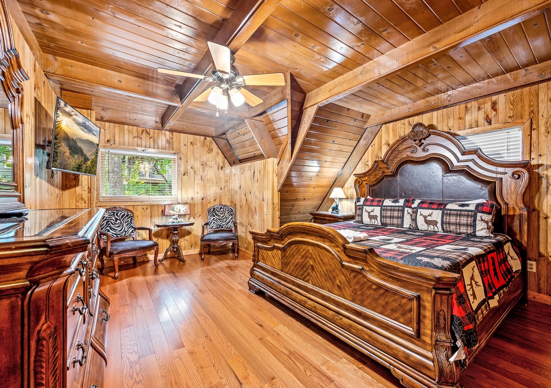 The majestic cabin features a total of six furnished bedrooms, tastefully decorated in classic ski chalet style. All offer high levels of comfort and convenience through their layout and royal-sized beds. Pick your bedroom to relax and rest after a memorable day of adventuring throughout the rich natural settings of Gatlinburg or the Great Smoky Mountains.