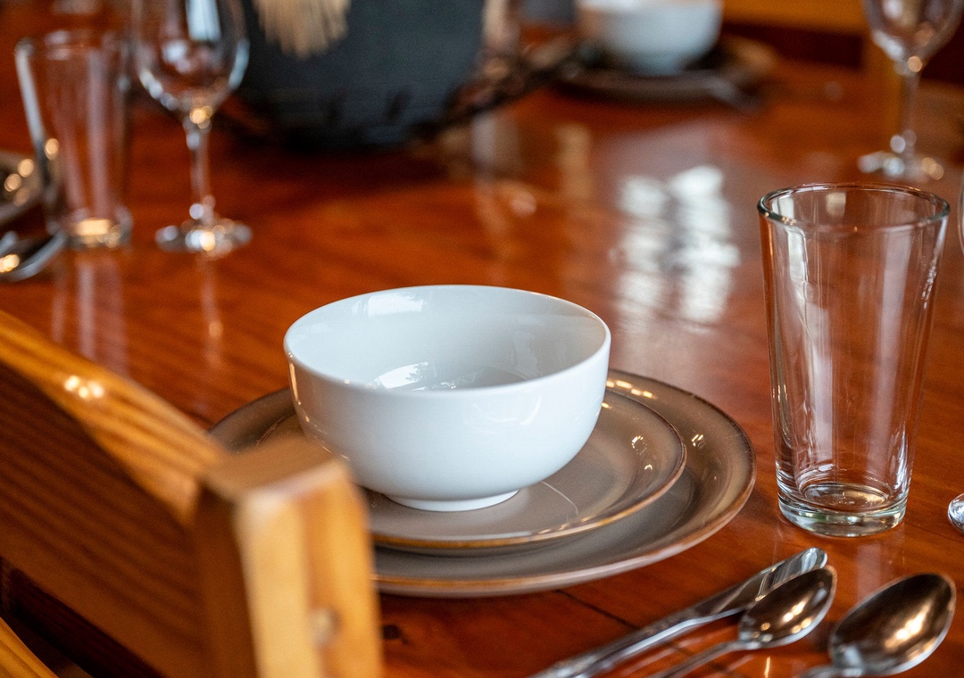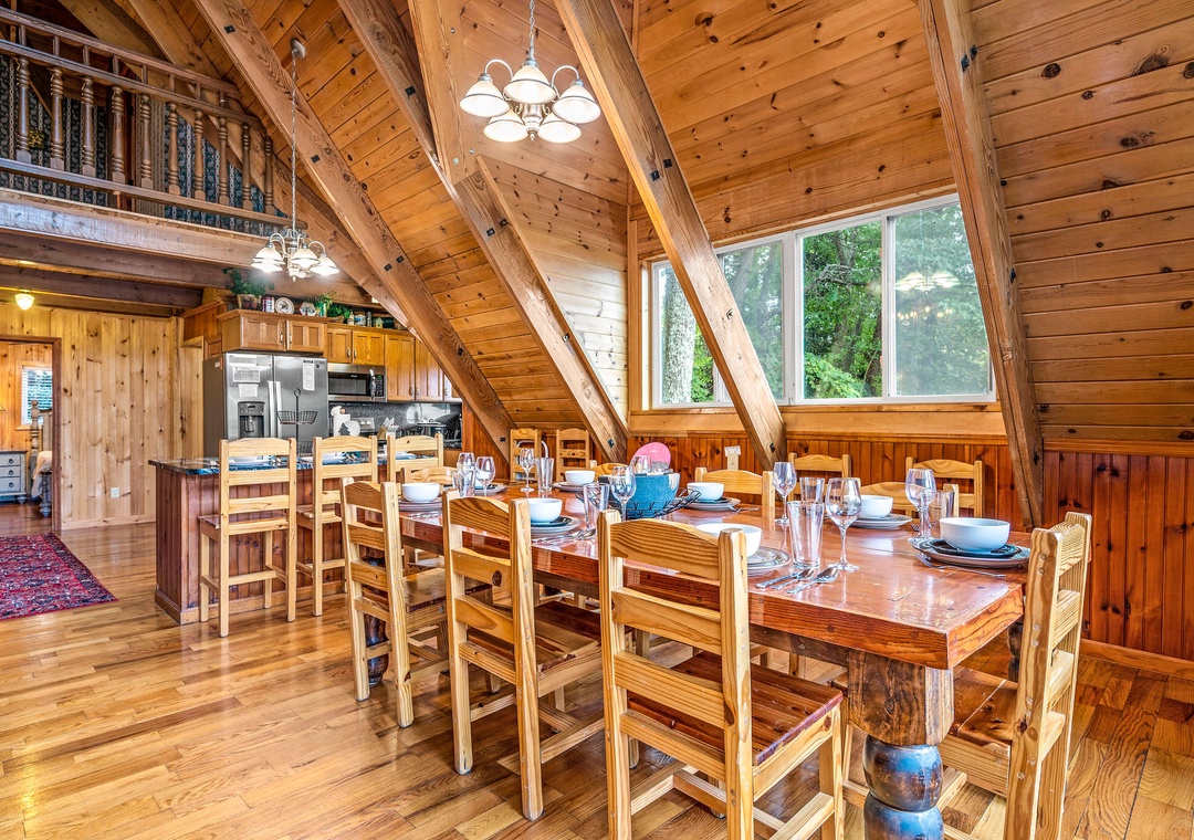 The lovely dining area sits right next to the kitchen. Serve your delicious meals for the whole family at the wooden dining table if you choose to stay in and enjoy a home-cooked meal while gazing outside at the ski slopes!