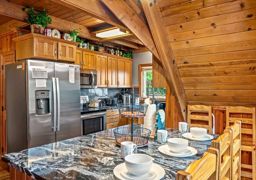 This fully stocked kitchen feels like your personal cozy diner -- get ready to enjoy preparing all your delicious here! Ample countertops and the kitchen island provide plenty of space to arrange tasty delicacies.
