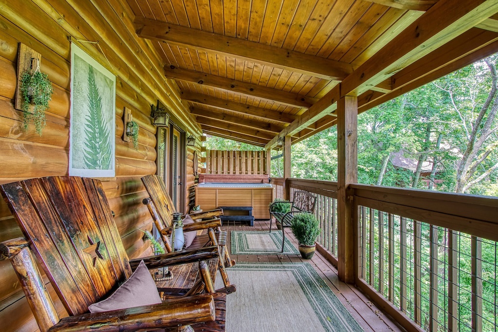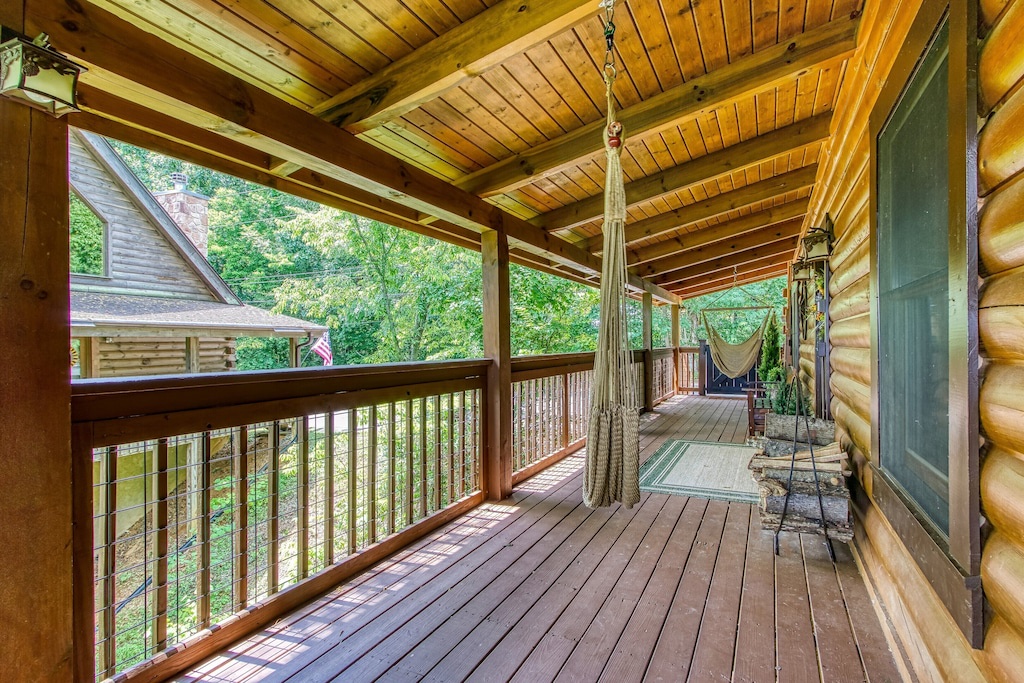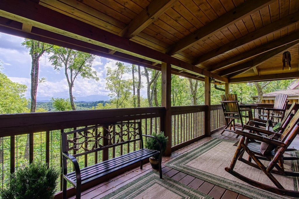 Furnished deck, wonderful views, loads of rocking chairs, hammock, hot tub