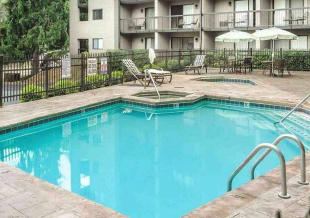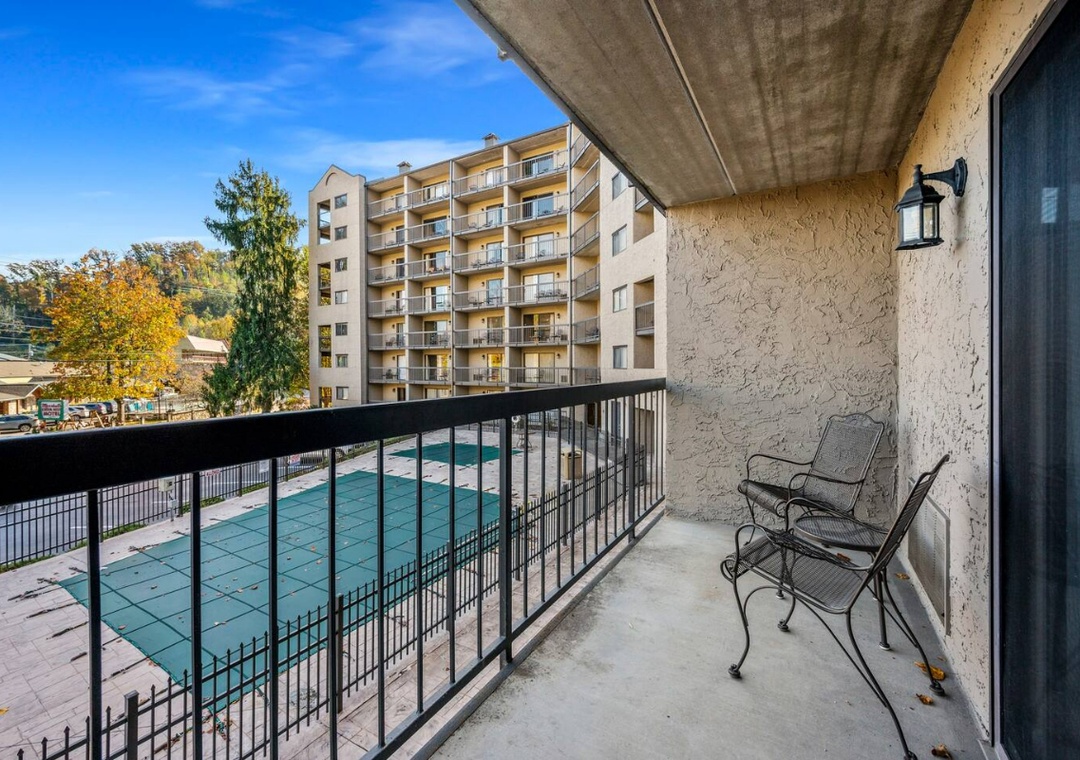 Spacious balcony with pool views; Gorgeous outdoor community pool with large hot tub to sit back and relax after a long day of hiking or shopping. It's typically open May to August, weather permitting.