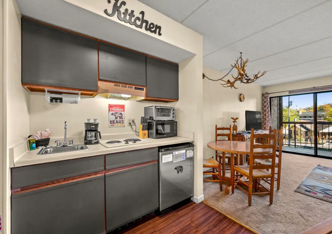 Chic and fully furnished condo; Spacious living room with balcony with pool views; Gas fireplace for cozy nights; Comfortable sleeper sofa in the living room; Smart TV; Free Wi-Fi ; Dining area; Fully furnished kitchenette