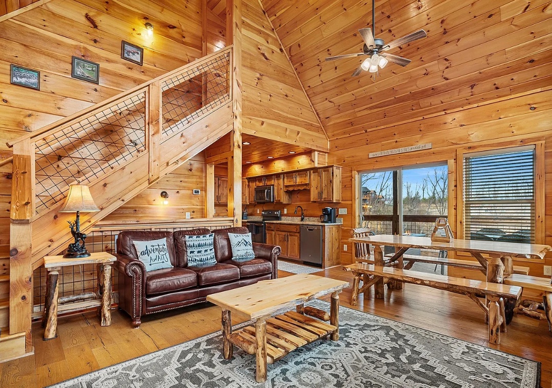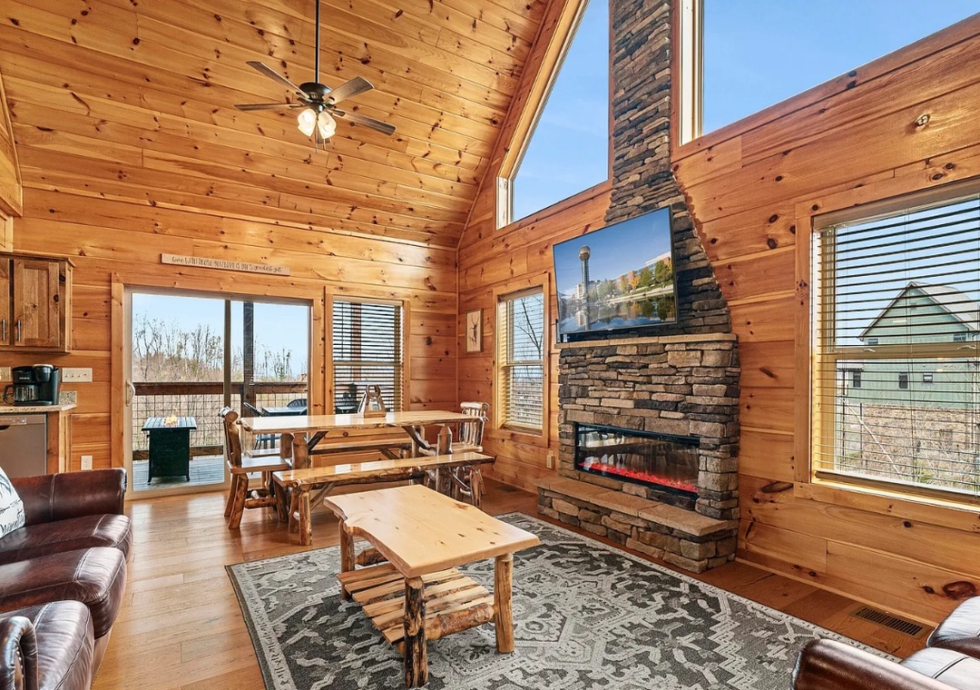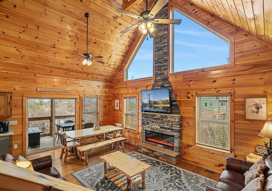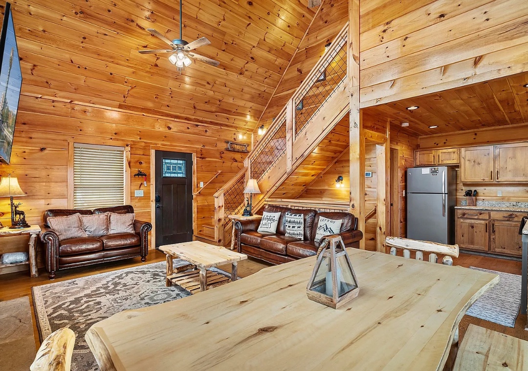 Step inside and be greeted by a warm fireplace and soaring cathedral ceilings that accentuate the spacious and airy design of the cabin. Large windows flood the cozy living area with natural light, creating a seamless connection between the indoors and the serene views. Whether you’re curling up with a book, sipping hot cocoa by the fire, or simply enjoying the view, this space is designed for comfort. The open-concept layout makes it easy to flow from one area to another, ensuring everyone feels connected while enjoying their own slice of the cabin’s charm.