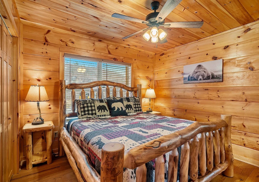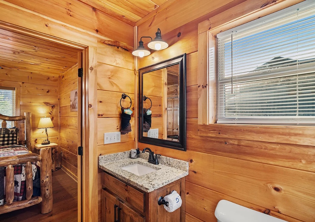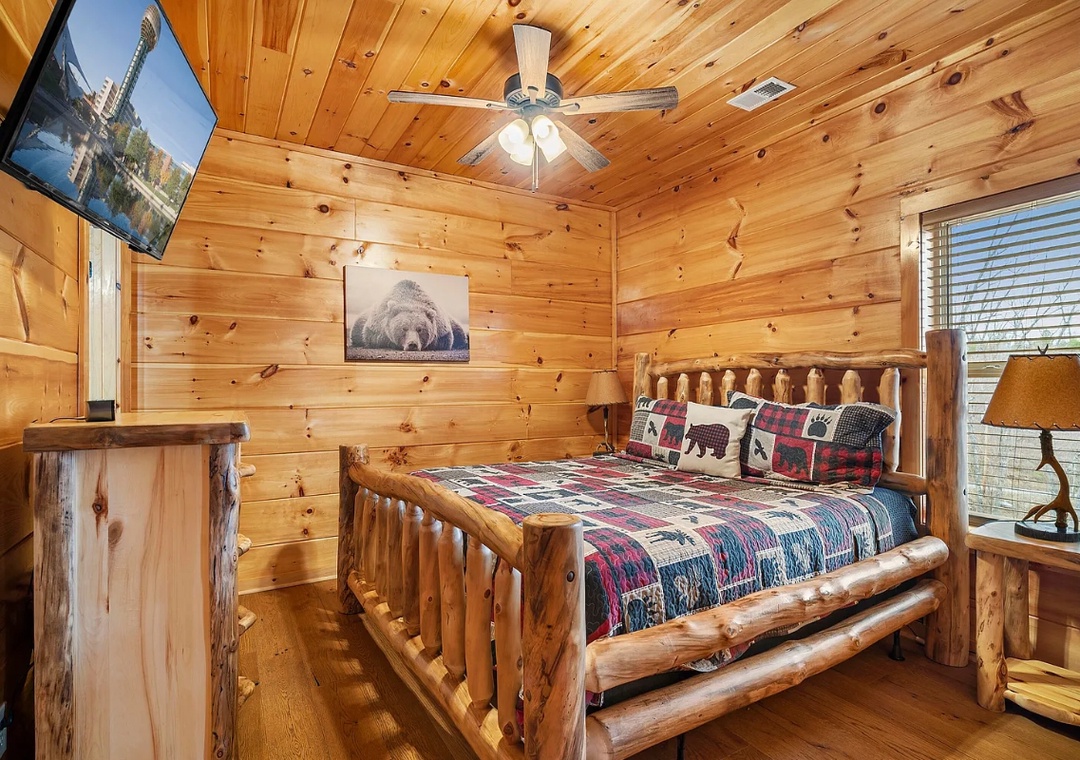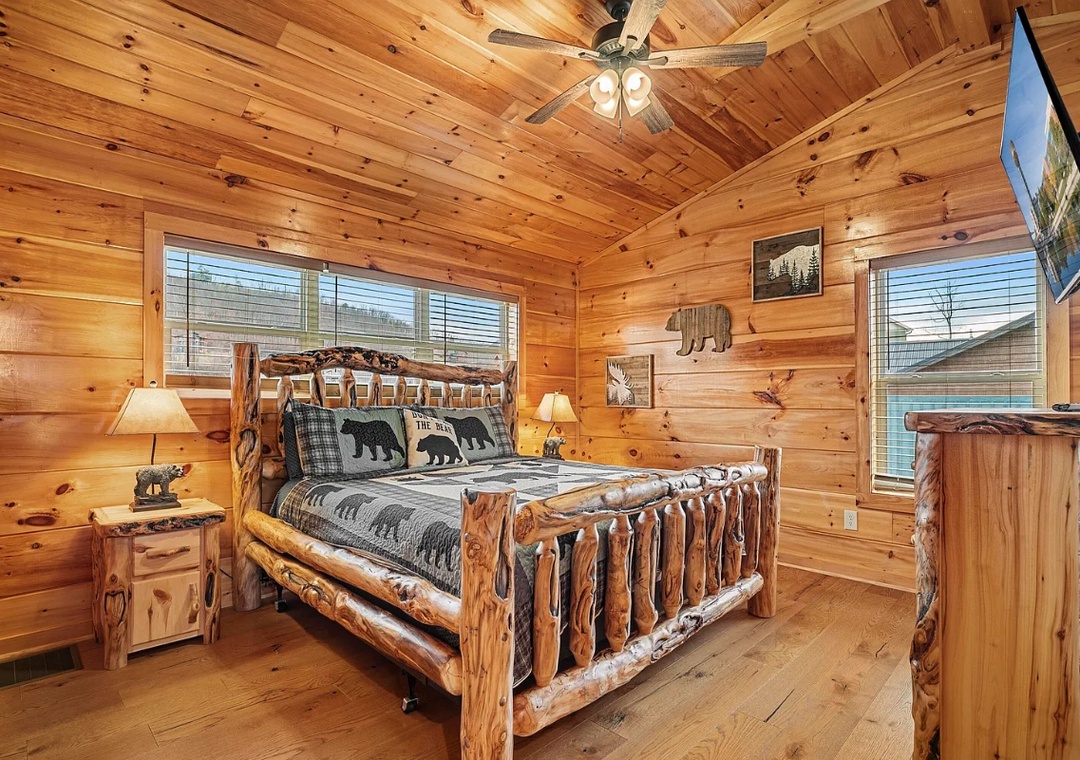 Step inside and be greeted by a warm fireplace and soaring cathedral ceilings that accentuate the spacious and airy design of the cabin. Large windows flood the cozy living area with natural light, creating a seamless connection between the indoors and the serene views. Whether you’re curling up with a book, sipping hot cocoa by the fire, or simply enjoying the view, this space is designed for comfort. The open-concept layout makes it easy to flow from one area to another, ensuring everyone feels connected while enjoying their own slice of the cabin’s charm.