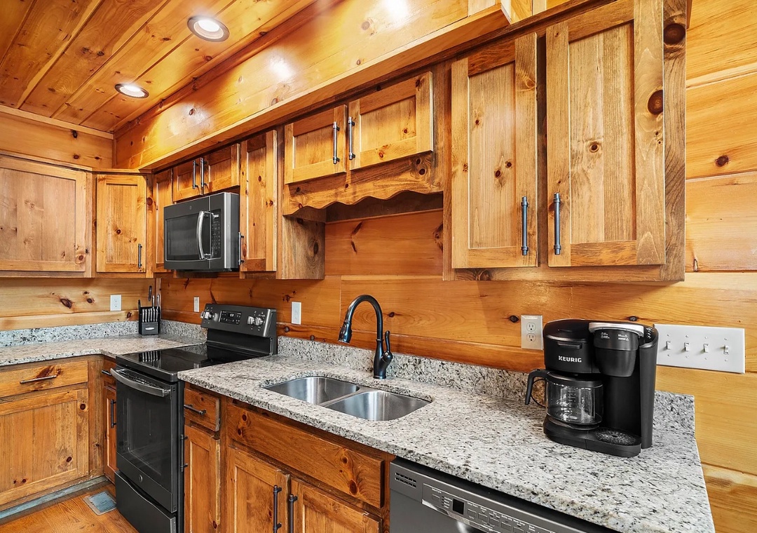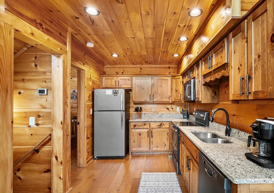 The fully equipped kitchen is a chef’s dream, featuring sleek granite countertops, modern appliances, and all the tools you need to prepare hearty meals for your group. Start your mornings with a fresh cup of coffee and breakfast at the dining table, or take advantage of the al fresco dining area on the deck for meals surrounded by nature.