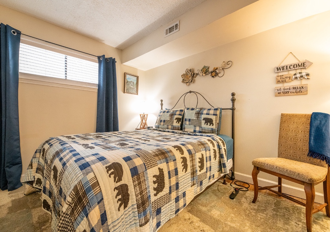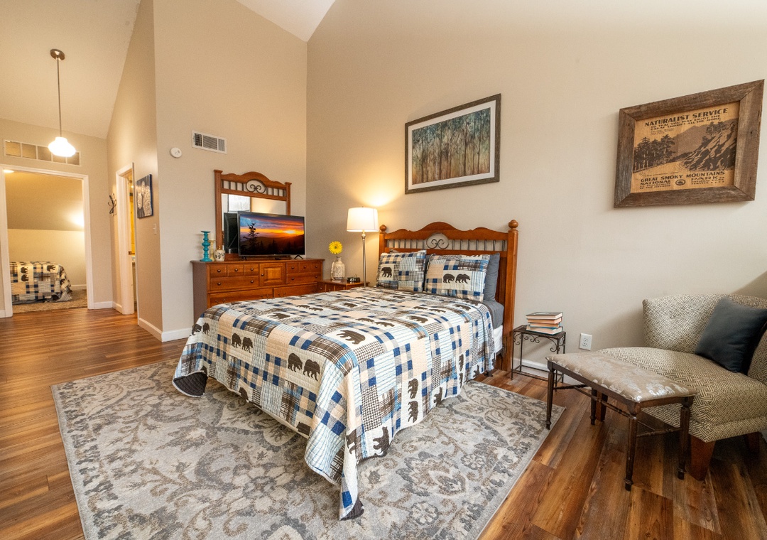 ✔ Bedroom #1 (Main Level): Comfortable Bedroom with a Queen Bed and Flat-screen TV, Access to a Full Bathroom with Shower/Tub Combo