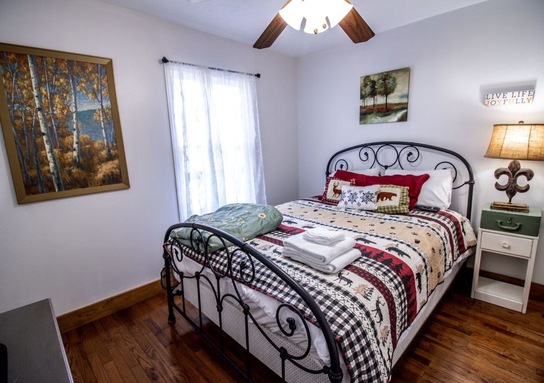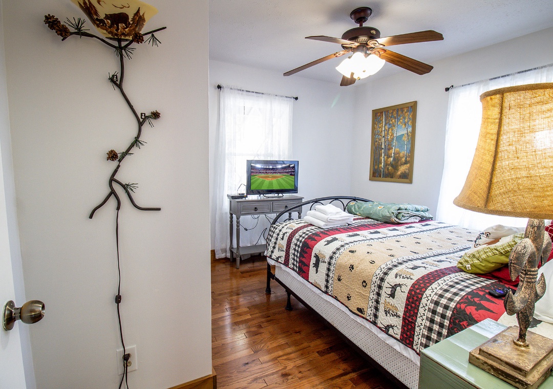 ✔ Bedroom #2 (Main Level): Inviting Bedroom with a Queen-sized Bed and a Flat-screen TV; Access to the Main Level Bathroom with Shower/Tub Combo