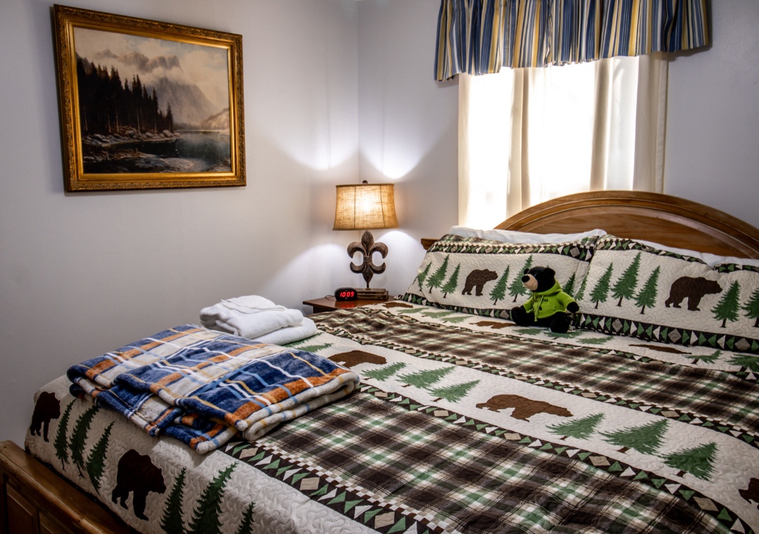The open-concept living area is filled with natural light and highlighted by large windows and rustic wood accents that reflect the beauty of the surrounding landscape. At the heart of the room is a cozy propane fireplace, offering instant warmth and ambiance as you settle in after a day of adventure. Soft seating invites you to sink in and relax, whether you're reading a book or chatting with loved ones. Just across the living area, find the thoughtfully appointed kitchen that makes mealtime a breeze. Also on the main level, find each of the two bedrooms offering a peaceful place to rest, with cabin-inspired aesthetics. Free WiFi is also available throughout the property.
