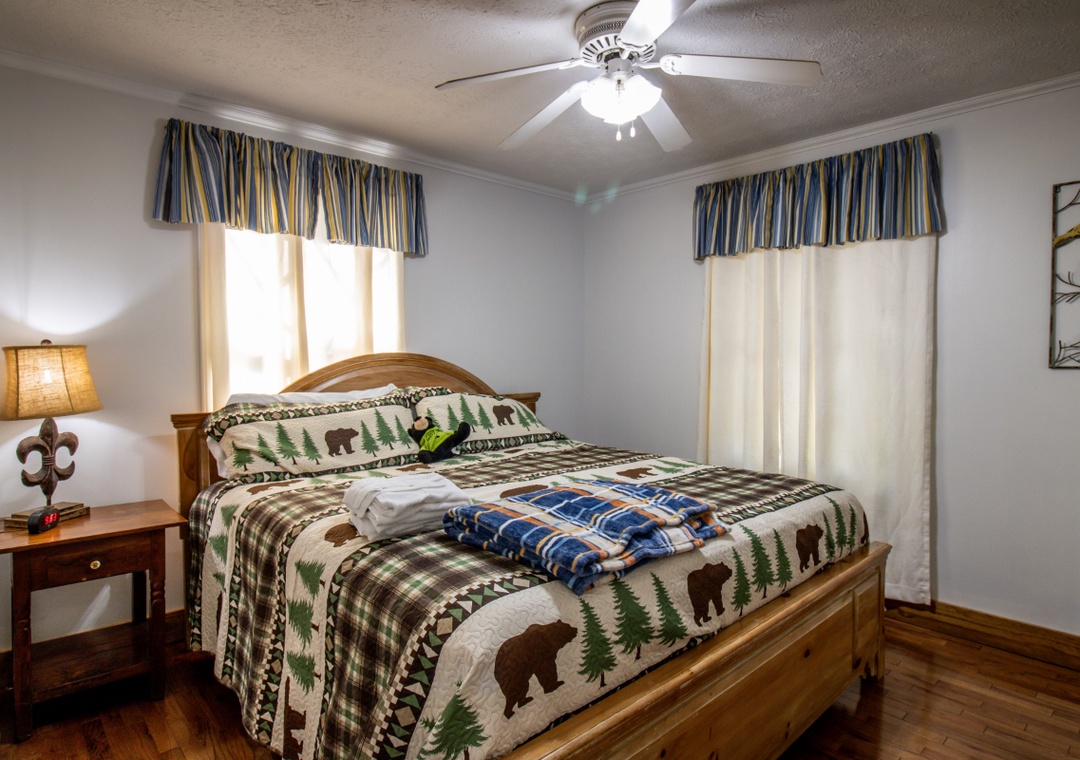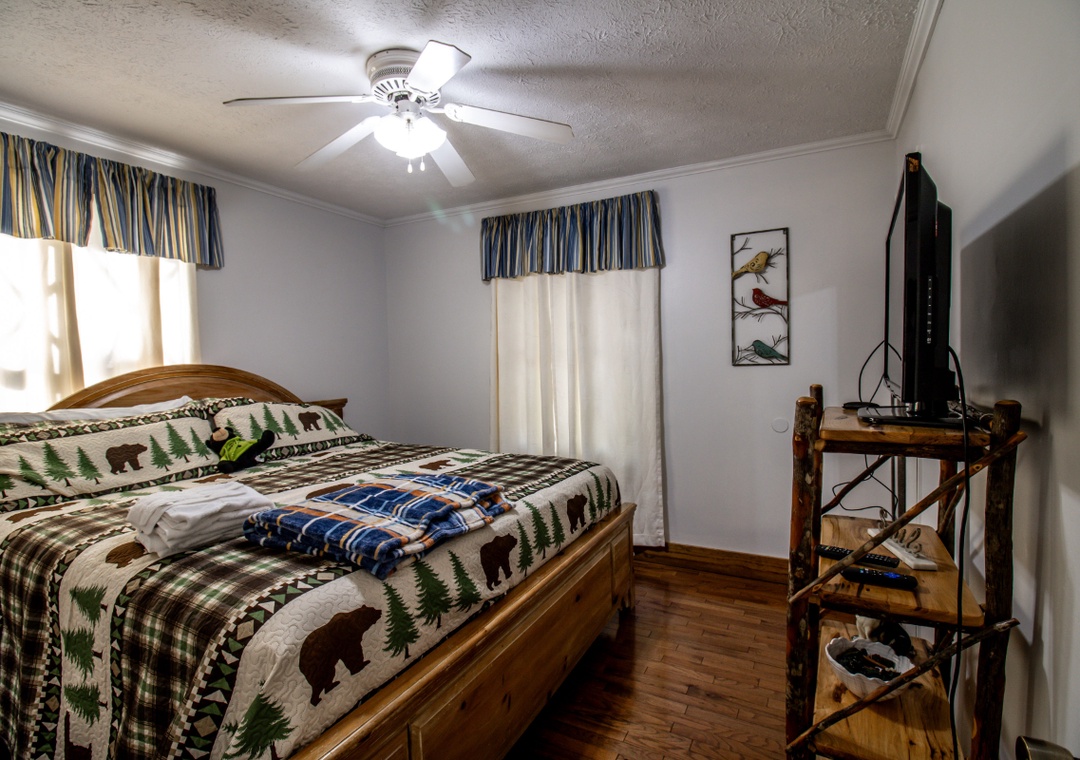 ✔ Bedroom #1 (Main Level): Spacious Bedroom with a King-sized Bed and a Flat-screen TV; Access to the Main Level Bathroom with Shower/Tub Combo