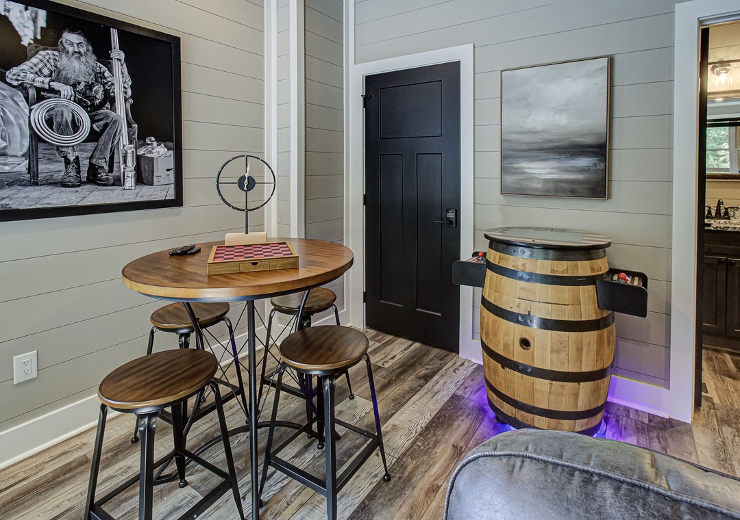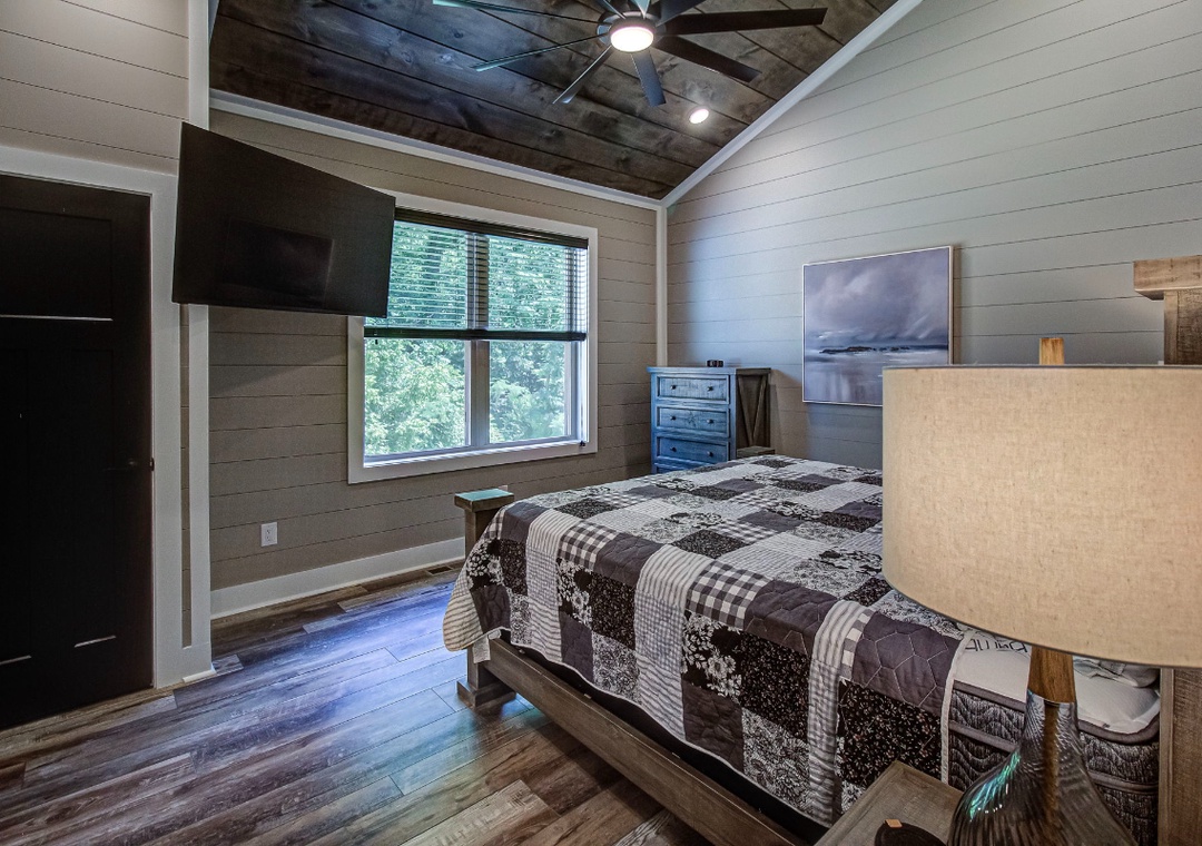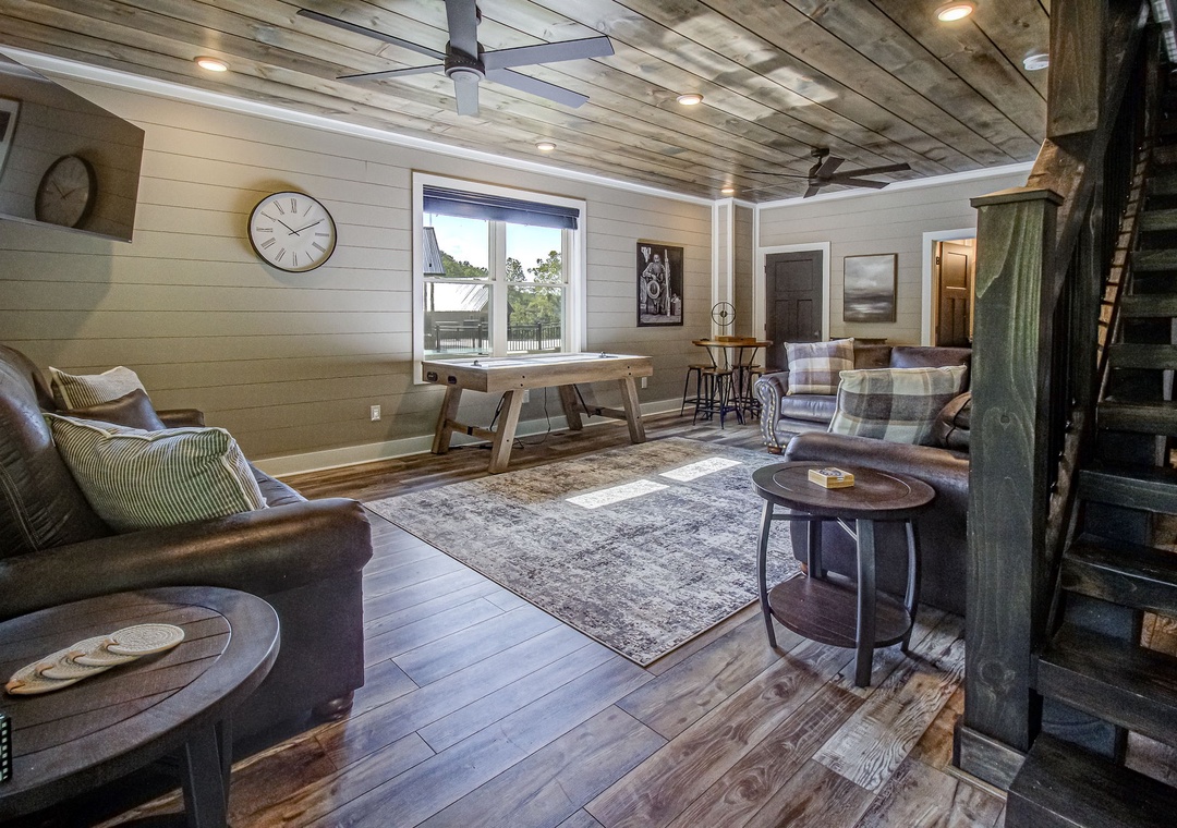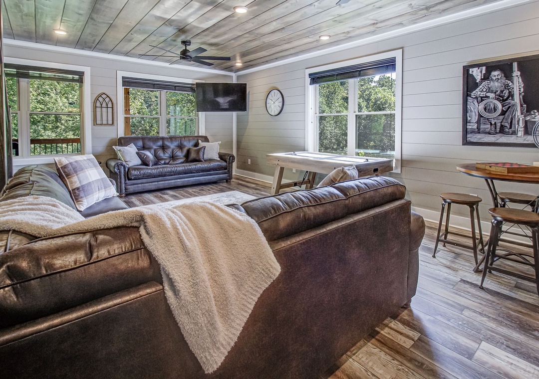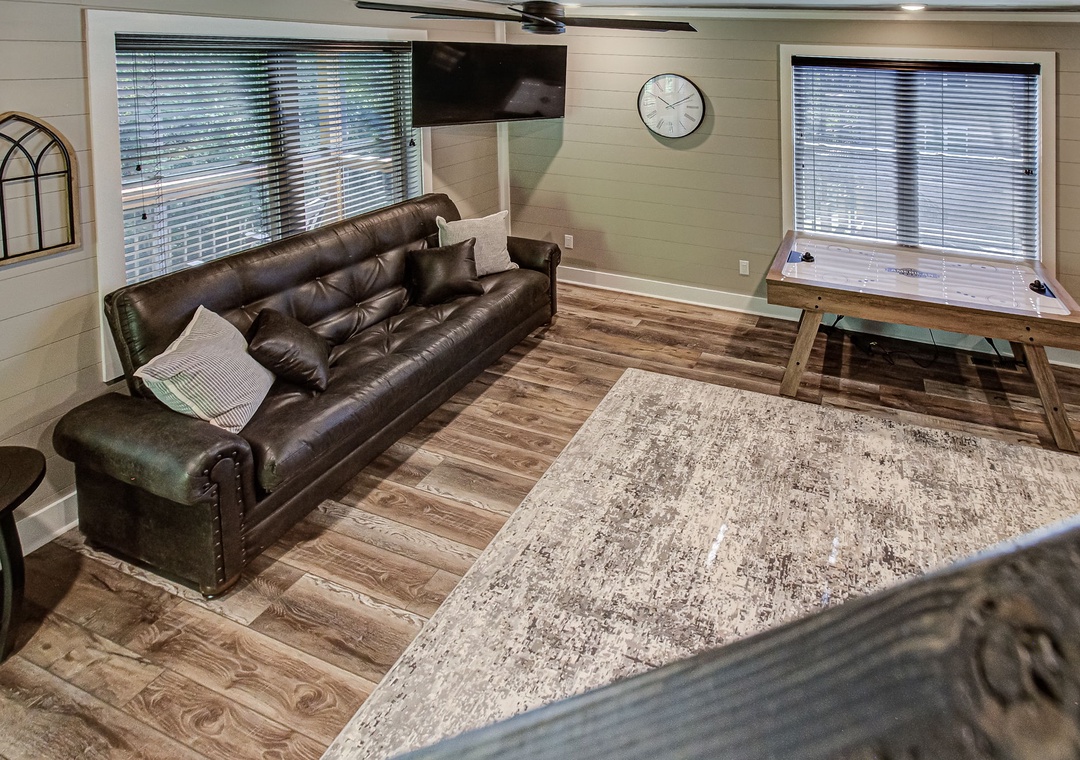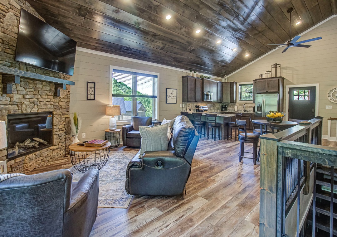 The living room is styled with rich cabin décor that celebrates the Smokies while maintaining a clean, welcoming atmosphere. Large windows let in gentle light during the day, enhancing the open feel of the room and providing a glimpse of the surrounding greenery even while you’re indoors. Just off the living space is the fully equipped kitchen, a true highlight of Hilltop Haven’s design. On this level, the first bedroom offers a private sanctuary, giving you a restful space to recharge after a day in the mountains. Downstairs, the spacious game room serves as both an entertainment hub and an additional gathering space. Also on the lower level is a second bedroom, offering the same comfort and privacy as the one upstairs. Free WiFi is also available throughout the property.