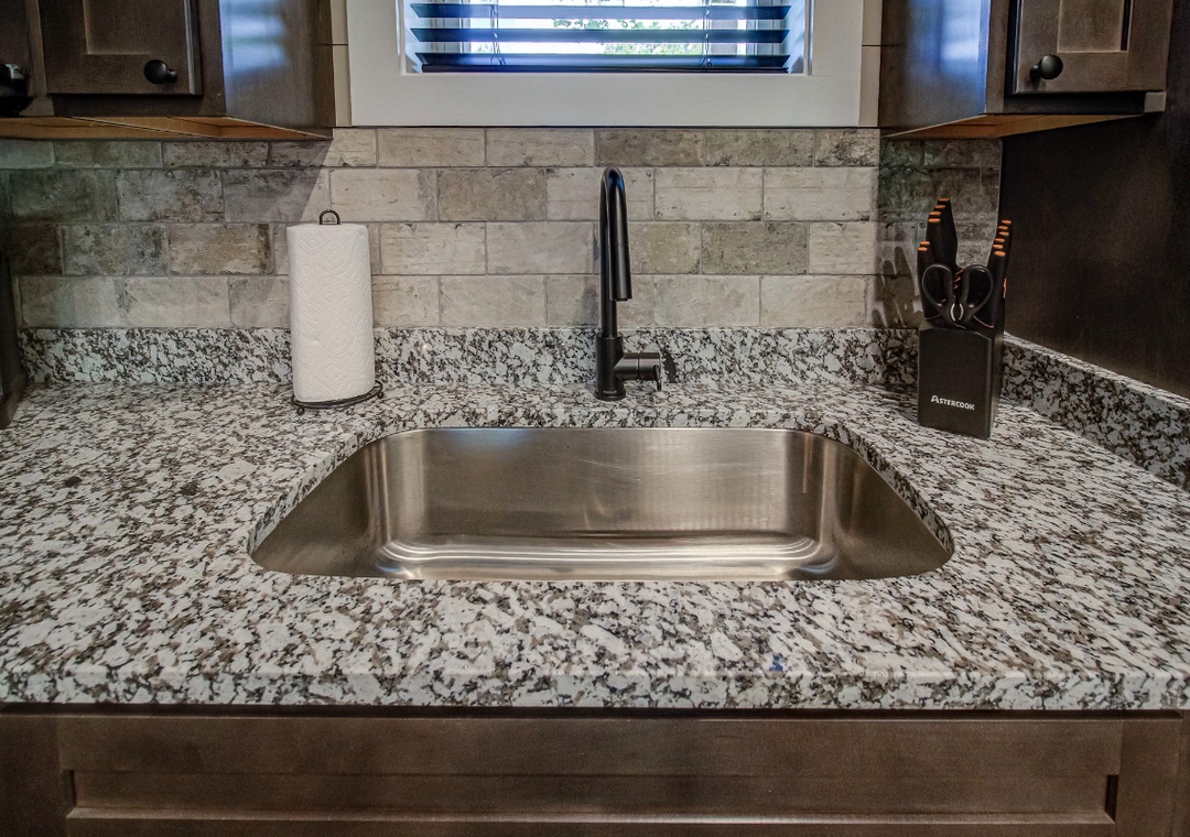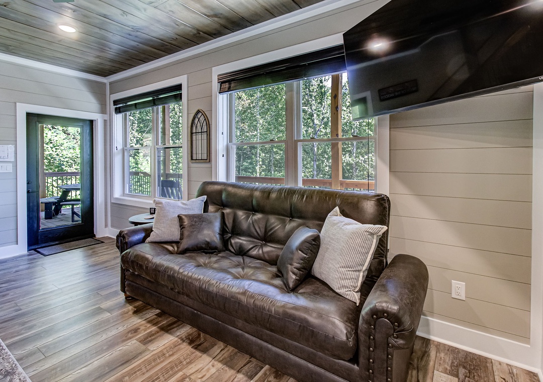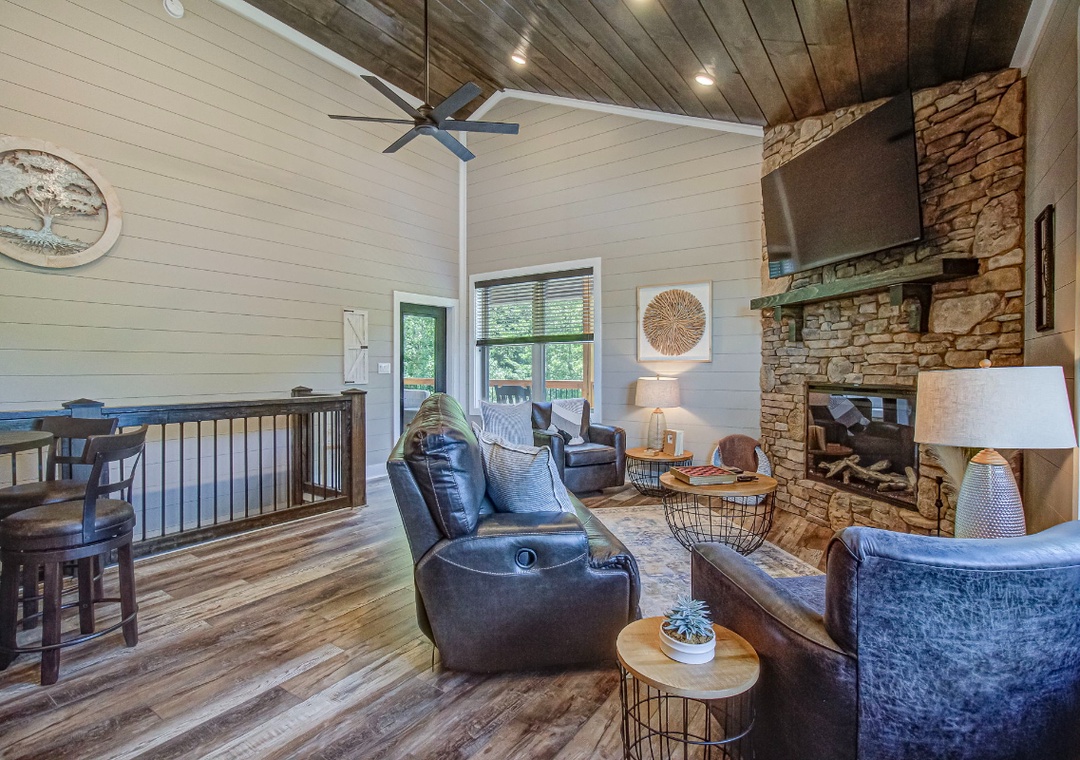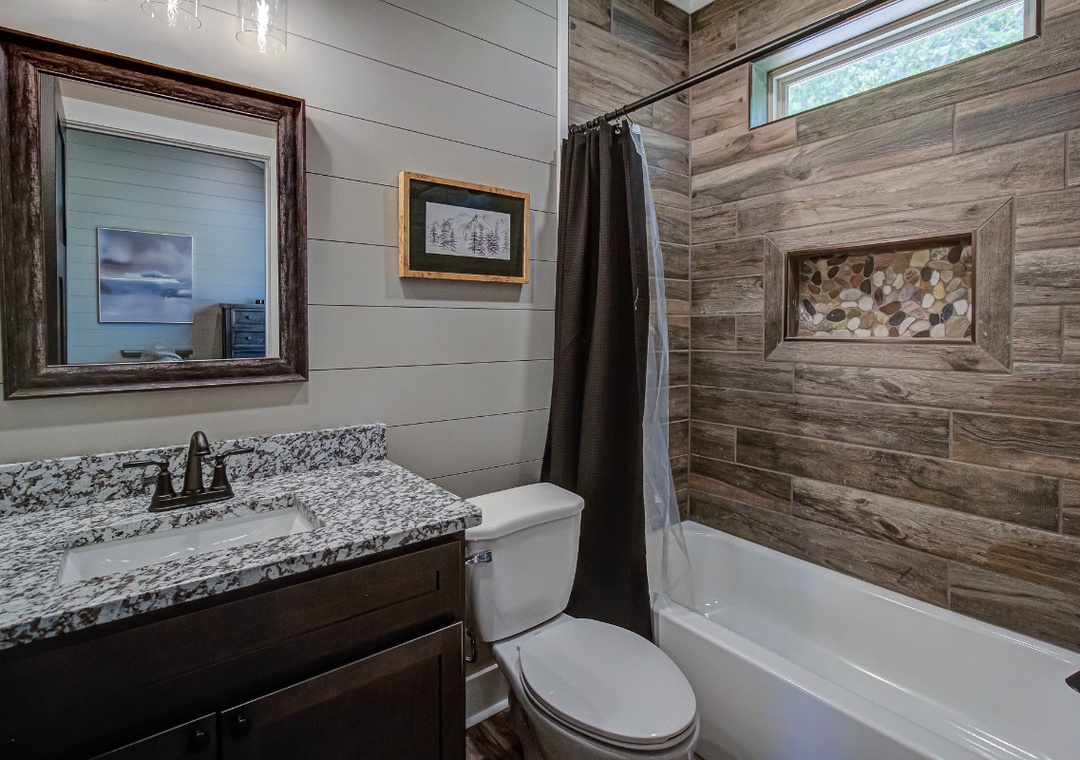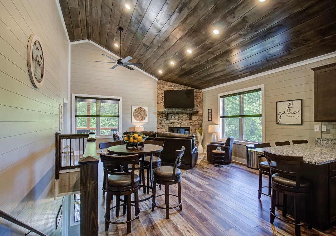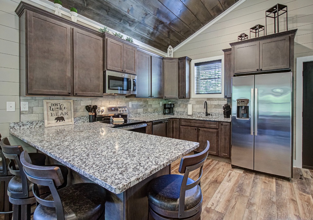 The living room is styled with rich cabin décor that celebrates the Smokies while maintaining a clean, welcoming atmosphere. Large windows let in gentle light during the day, enhancing the open feel of the room and providing a glimpse of the surrounding greenery even while you’re indoors. Just off the living space is the fully equipped kitchen, a true highlight of Hilltop Haven’s design. On this level, the first bedroom offers a private sanctuary, giving you a restful space to recharge after a day in the mountains. Downstairs, the spacious game room serves as both an entertainment hub and an additional gathering space. Also on the lower level is a second bedroom, offering the same comfort and privacy as the one upstairs. Free WiFi is also available throughout the property.