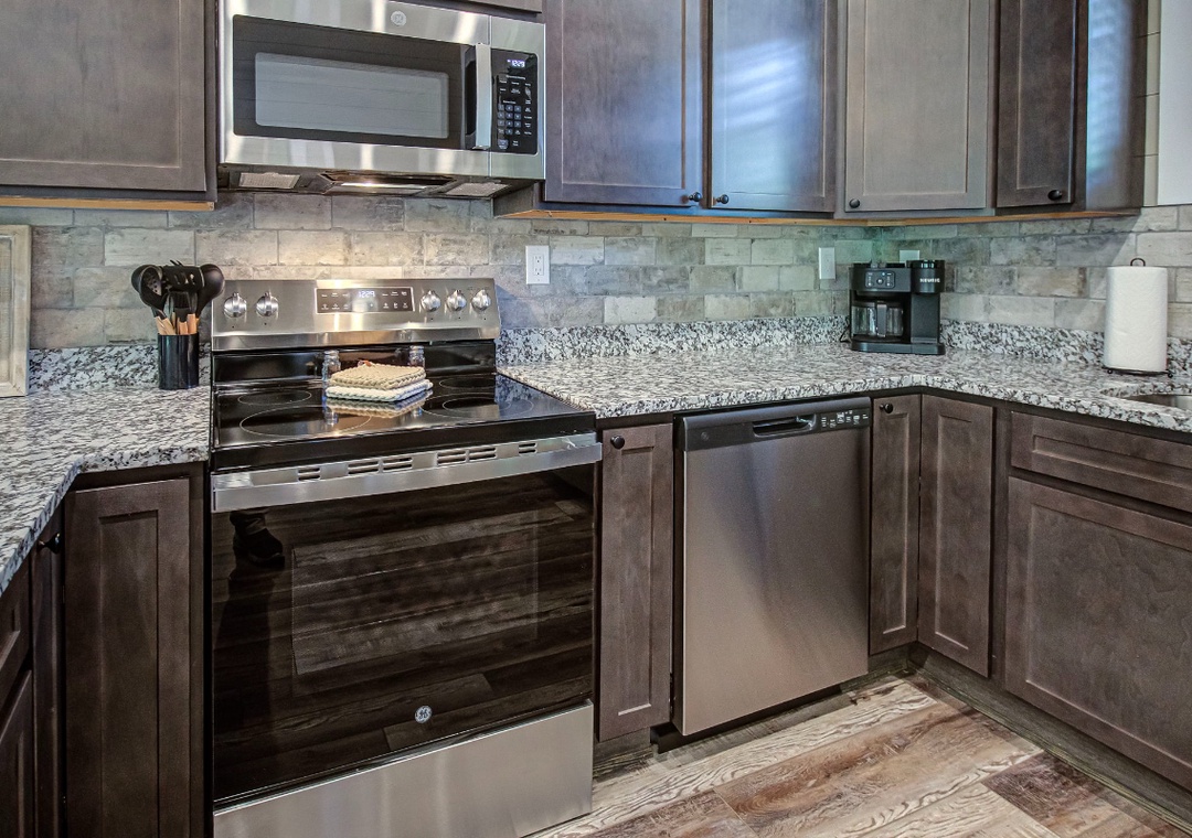 The fully-equipped, spacious kitchen boasts modern amenities, making it easy to prepare delicious meals for your family or friends. Well-appointed with a full-sized refrigerator, dishwasher, stove, microwave, and other kitchen appliances perfect for making breakfast, lunch, or dinner throughout your stay! All pots, pans, glasses, plates, silverware, etc., are also there for you! Gather around the inviting dining table or the chic coffee table to share stories and laughter, as it invites you to savor each bite while taking in the natural beauty of the surroundings.