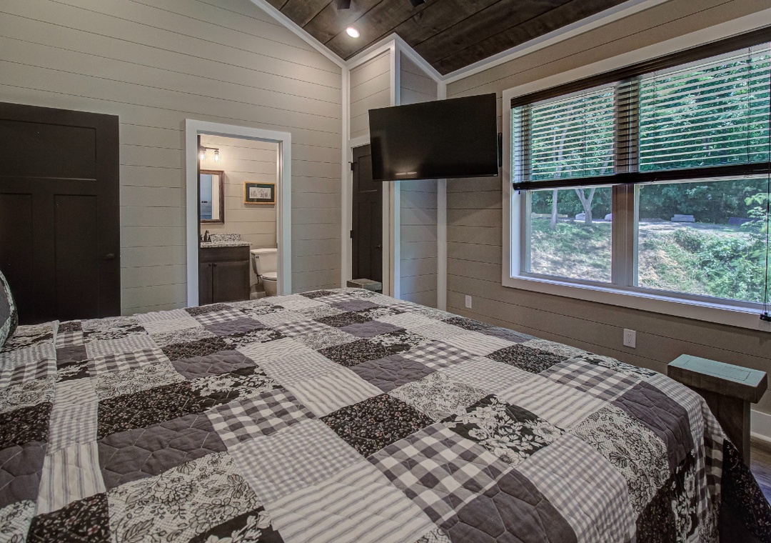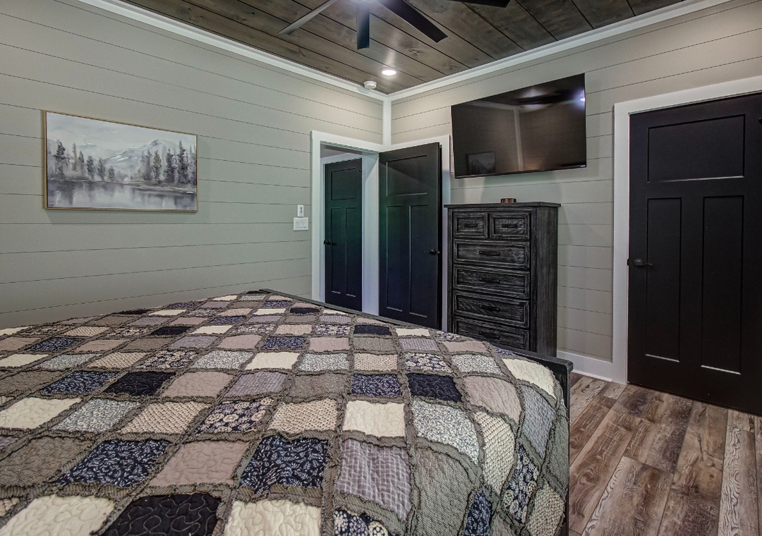 ✔ Bedroom #1 (Main Level): Spacious Bedroom with a King-size Bed, Flat-screen TV, and Attached Full Bathroom with Shower/Tub Combo