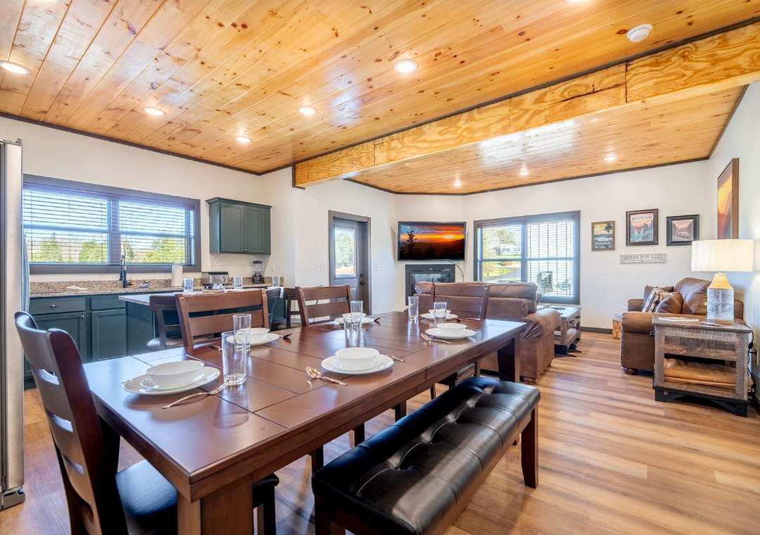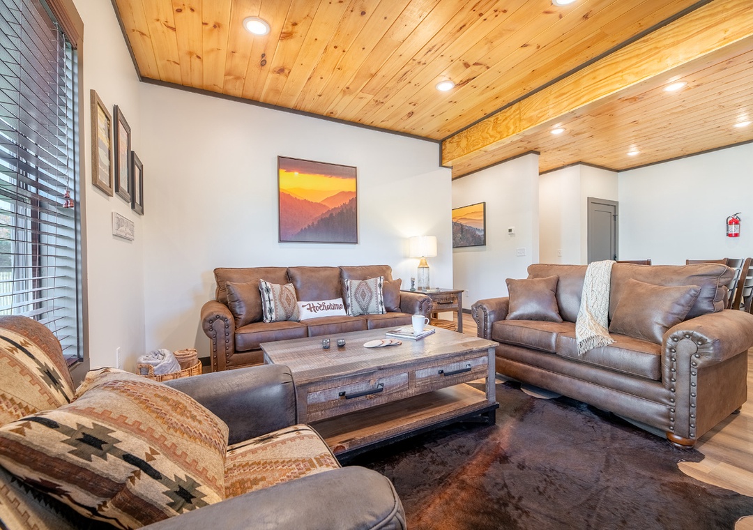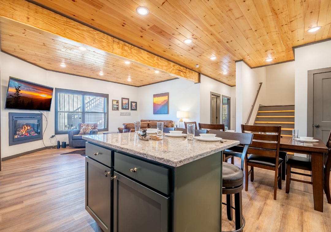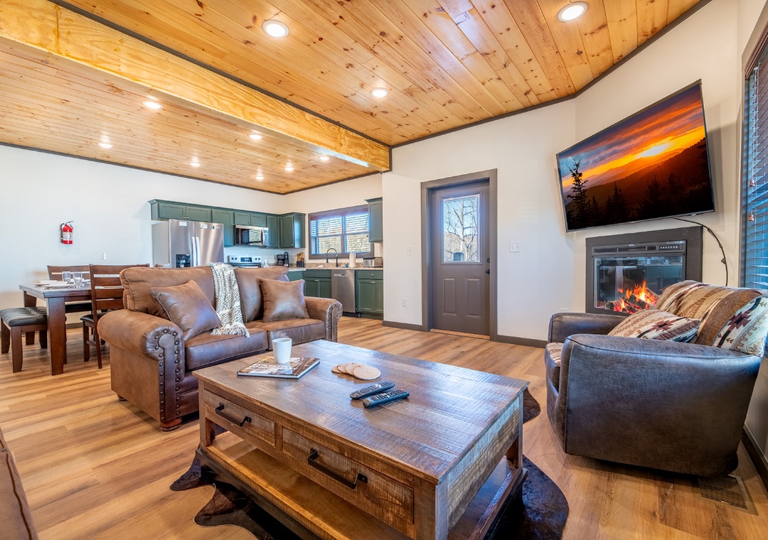 The heart of the home is the main living room, where a stylish electric fireplace casts a soft, inviting glow and a large smart TV anchors the space for cozy movie nights and lazy afternoons. Plush seating wraps the room, creating a welcoming spot for everyone to settle in after exploring the Smokies. Across the living room is the kitchen, offering a bright, modern, and fully equipped space perfect for cooking and gathering. Just beyond the kitchen, a welcoming dining area creates a warm, communal space for sharing meals and conversation. The indoor living experience continues downstairs in the game room, which transforms the cabin into a full-on entertainment hub. Free WiFi is also available throughout the property.