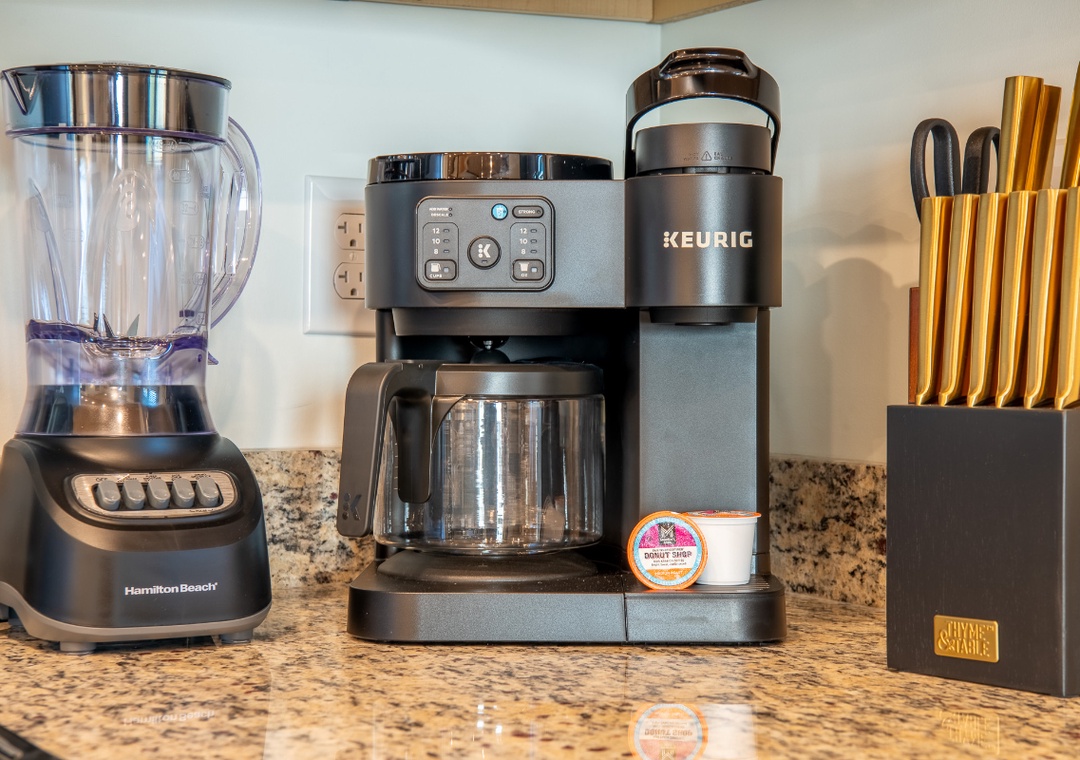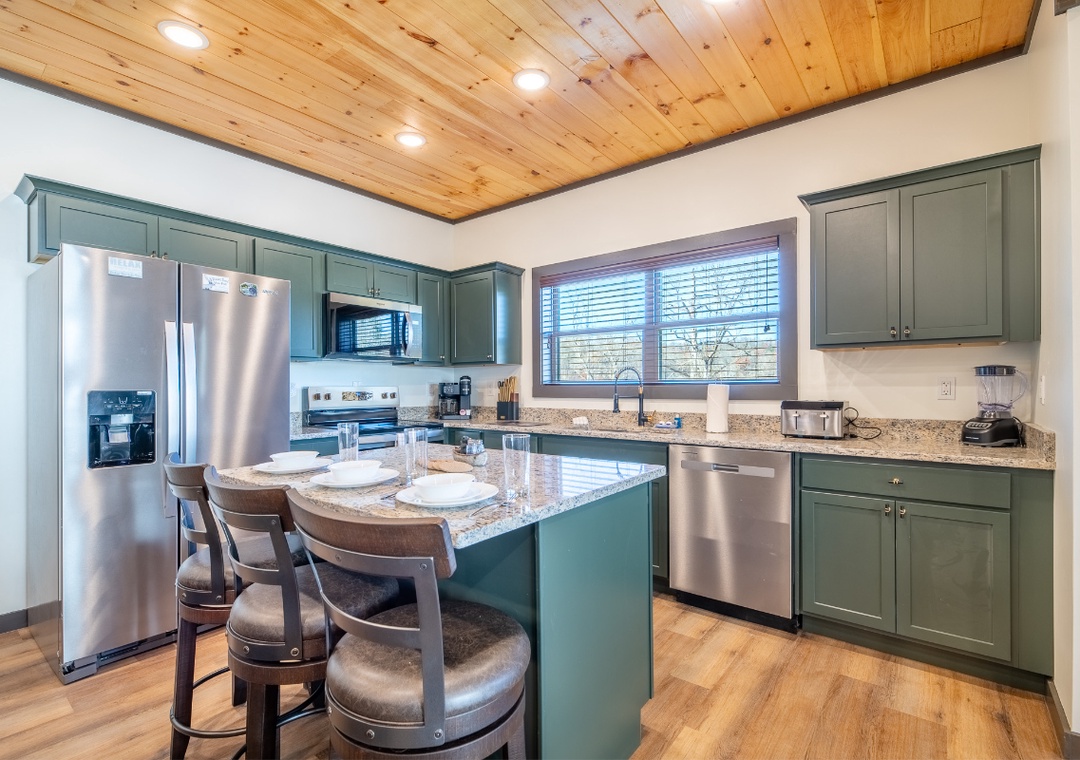 The fully-equipped kitchen boasts modern amenities, making it easy to prepare delicious meals for your family or friends. Well-appointed with a refrigerator, stove, microwave, and other kitchen appliances, perfect for making breakfast, lunch, or dinner throughout your stay! All pots, pans, glasses, plates, silverware, etc., are also there for you! Gather around the inviting dining table or the kitchen island that doubles as a breakfast bar to share stories and laughter while gathering over a delicious meal.