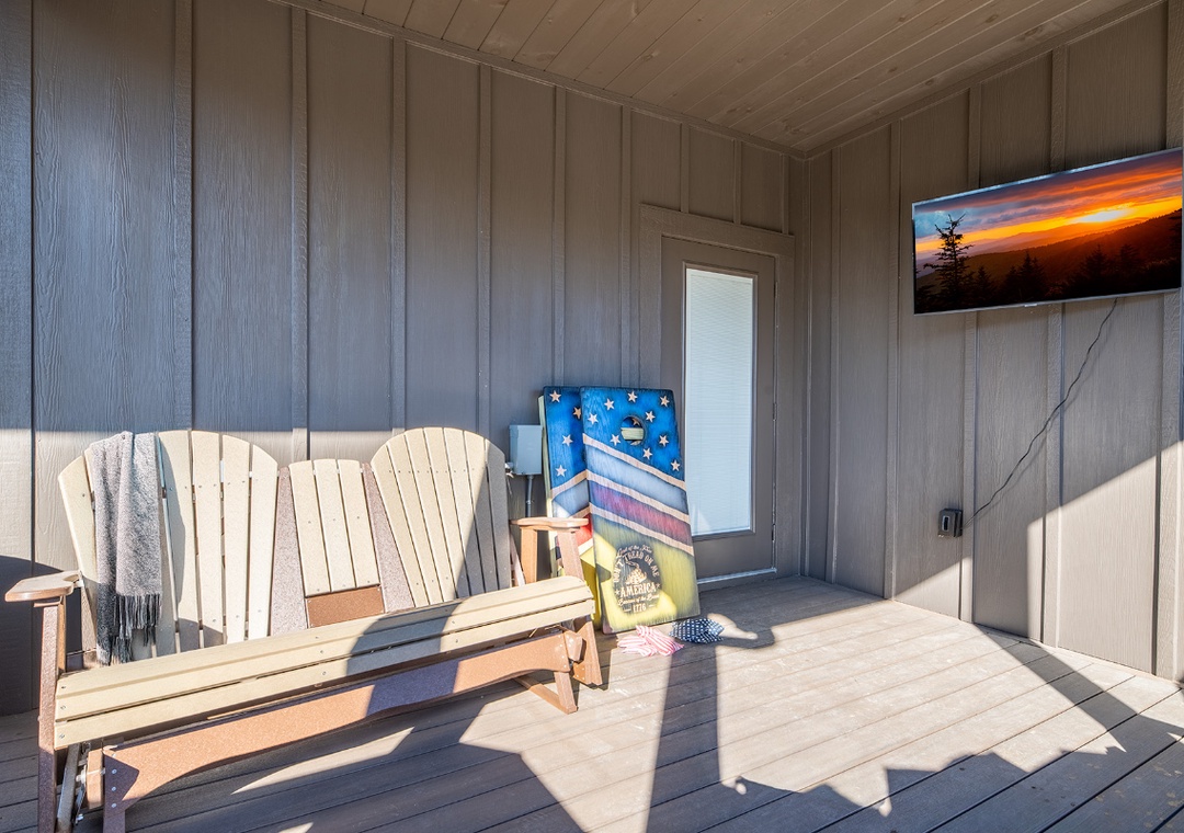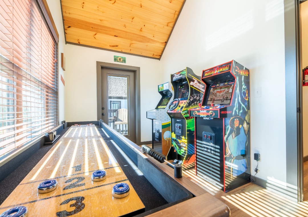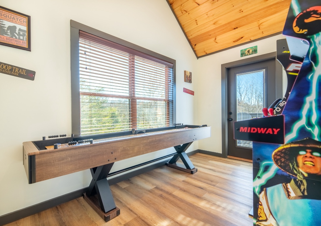 Hochatime truly shines with its wide variety of entertainment options. The game room is a standout destination all on its own, featuring a classic Shuffleboard Table and three full arcade machines: the iconic Mortal Kombat Arcade, the high-energy Fast and Furious driving game, and a nostalgic Gold Arcade machine to round out the fun. This space invites hours of friendly competition and laughter, making it a favorite hangout spot for kids and adults alike. Outside, on the main-level back deck, comes an entirely different kind of luxury with a private hot tub and its own flatscreen TV, creating a cozy spa-like experience surrounded by fresh mountain air. It’s the perfect spot to end a busy day exploring local trails, shops, or scenic overlooks. The corn hole setup adds another layer of excitement, perfect for sunshine-filled afternoons or laid-back evenings around the fire. Between soaking in the hot tub while watching your favorite show, enjoying endless rounds of arcade challenges, relaxing by the fireplace, or heading into town for shopping, dining, or seasonal events, Hochatime offers entertainment at every turn. It’s the ideal place to experience both the peaceful beauty of the Smoky Mountains and the lively attractions just minutes away.