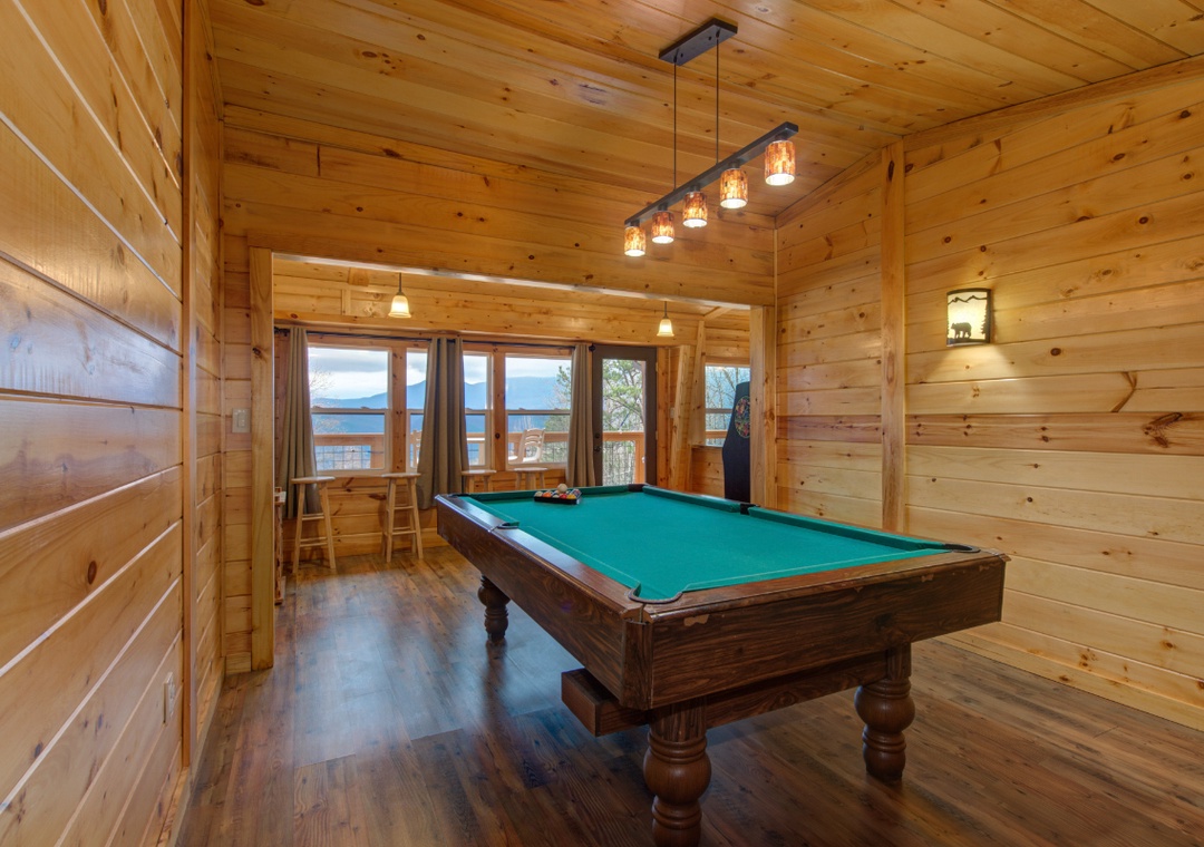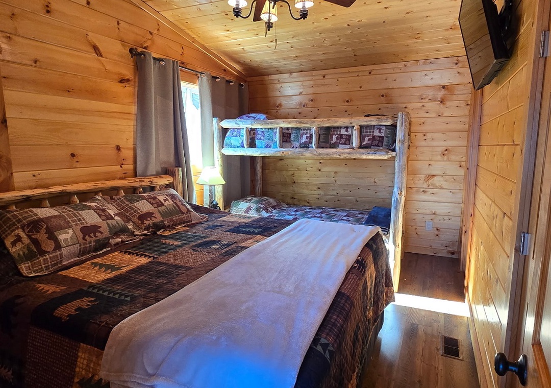 𝗨𝗽𝗽𝗲𝗿 𝗟𝗲𝘃𝗲𝗹 The "Entertainment Hub" — two king bedrooms, each with extra sleeping: the Family Suite (king + bunk beds) and the Flex Room (king + futon). Plus the game room and a private upper deck with Adirondack seating and a quiet high-top for two — the spot you'll fight over for morning coffee. Late-night pool games won't wake the early risers downstairs.