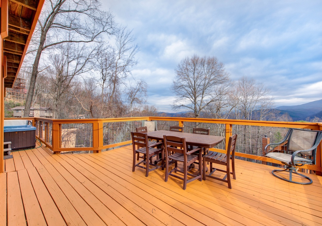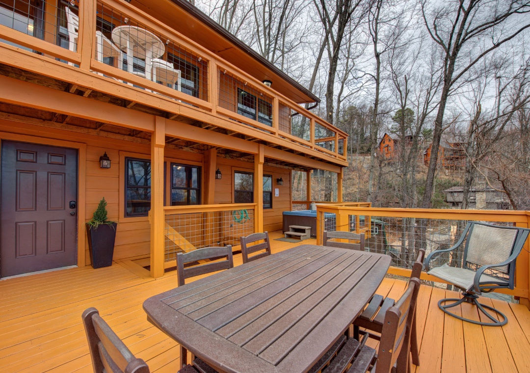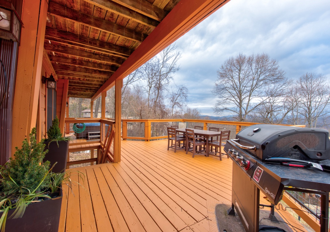 𝗠𝗮𝗶𝗻 𝗟𝗲𝘃𝗲𝗹 Two queen bedrooms, full kitchen, and the primary deck with hot tub, fire table, propane bbq grill, outdoor dining, and Mt. LeConte views.