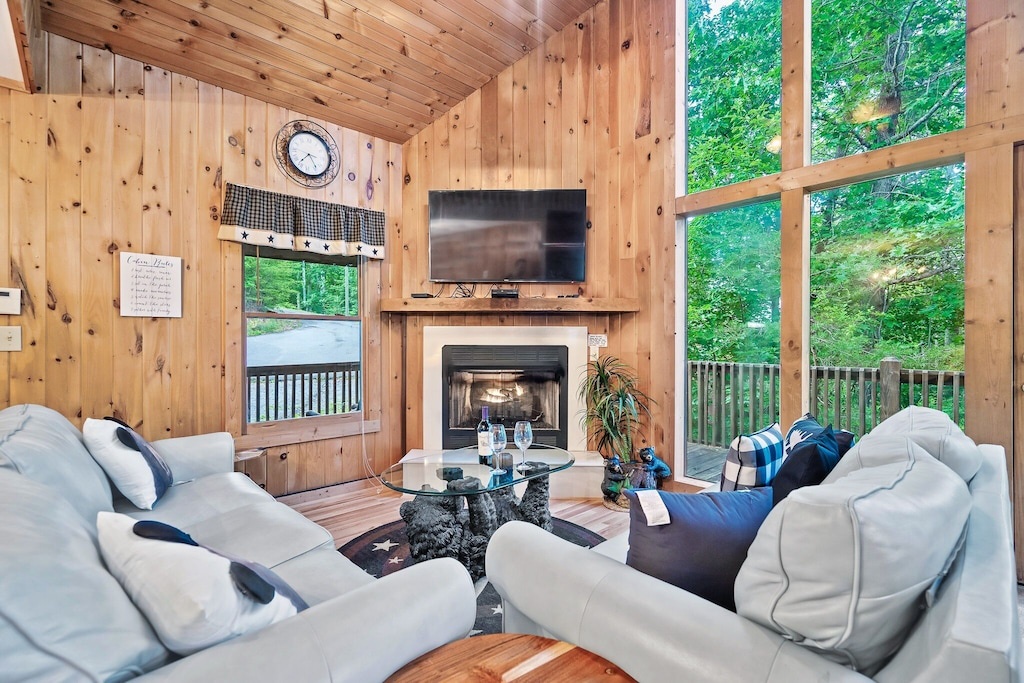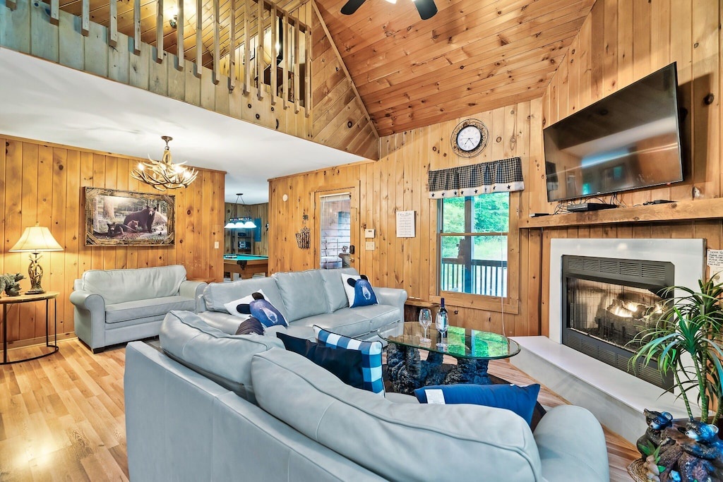Fully furnished log cabin home with mountain décor and tons of amenities; Spacious living area with fireplace, comfy couches and large flat screen TV; Open floor plan with living and dining on the same level; Separate game room; Modern and fully equipped kitchen; Spacious bedrooms; WiFi