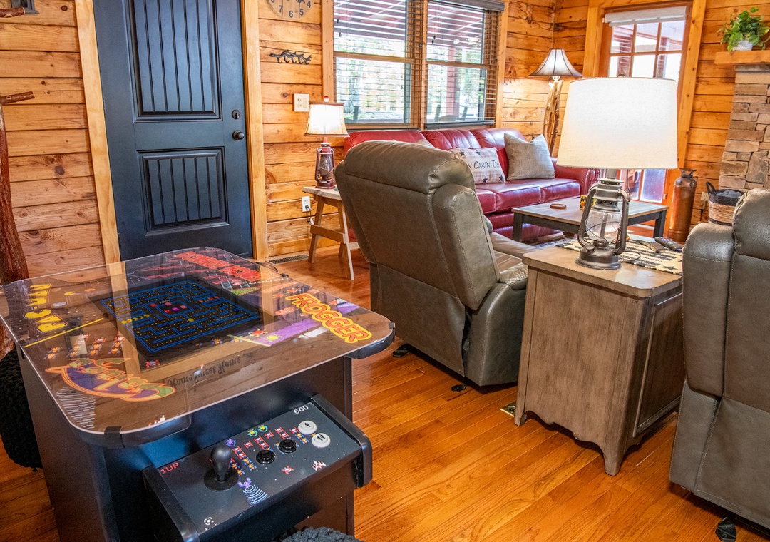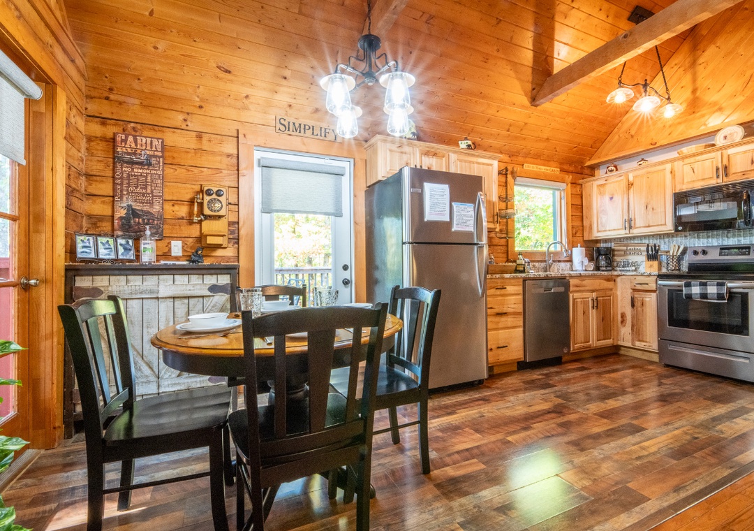 Our cabin’s living area greets you with inviting plush seating, where you can sink in and unwind in front of the propane fireplace, casting a warm glow across the room. But it offers more than just a place to relax – it’s filled with entertainment options designed for quality time together. There's an Icade console, bringing back the fun of classic arcade games right in the heart of the cabin. You’ll also find a thoughtfully stocked cabinet just behind the dining table with a variety of beloved board games for all ages. Adjacent to the living room, the kitchen and dining area are designed for gathering. Recently updated, the kitchen is fully equipped with modern appliances and everything you might need. Accessed from the living area, the screened porch features an enclosed hot tub, providing a private, relaxing retreat where you can unwind and rejuvenate. Free WiFi is also available throughout the property.