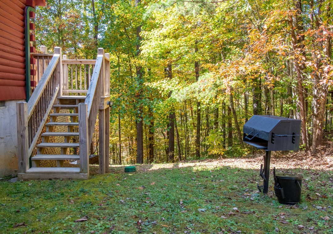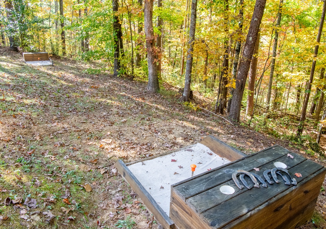 Step into the living room, where a cozy propane fireplace invites you to settle in for game nights or a movie marathon. For a unique twist, challenge your friends or family on the Icade console with classic arcade games that add a nostalgic charm to your stay. If you’re in the mood for traditional games, open the cabinet behind the dining table, stocked with an assortment of board games that range from family favorites to strategic challenges. The outdoor entertainment options are where "Lasting Memories" truly shines. Step onto the screened porch and you’ll find a corn hole setup, perfect for laid-back afternoons. Here, you’ll also discover a luxurious hot tub, ideal for unwinding after a day of mountain adventures. Its warm jets and peaceful surroundings create an unbeatable relaxation experience right on your private porch. In the backyard, inviting horseshoe pits await. This classic game adds a fun, competitive element to your stay and is the perfect way to enjoy the spacious, usable yard. On the right side of the property, a park-style grill provides the perfect setup for a cookout, adding to the outdoor fun with a barbecue feast for everyone to enjoy.