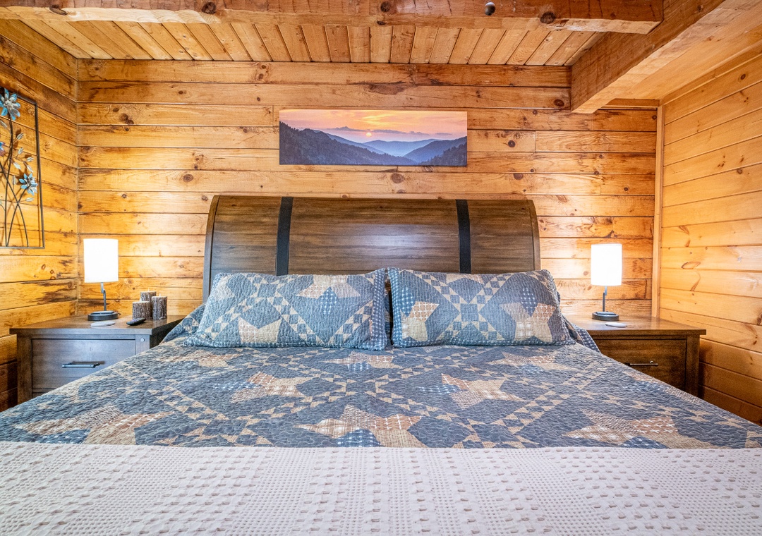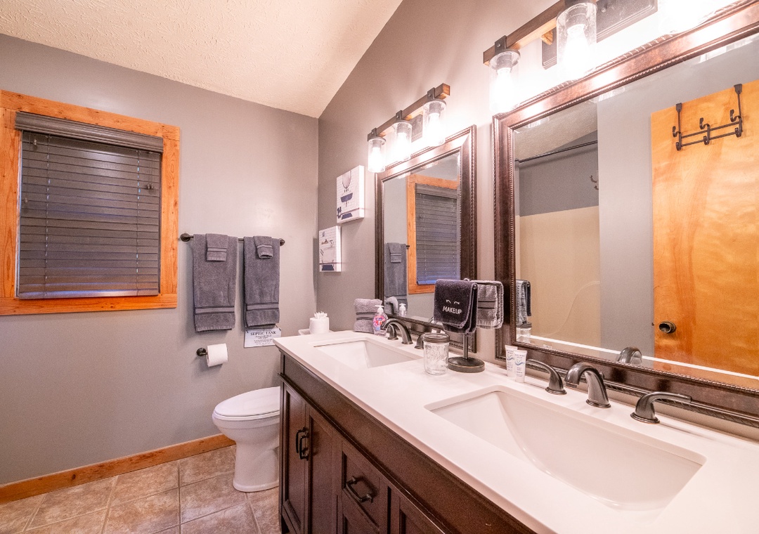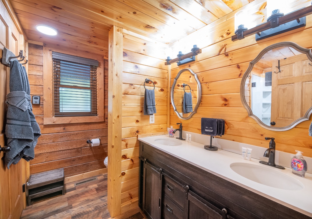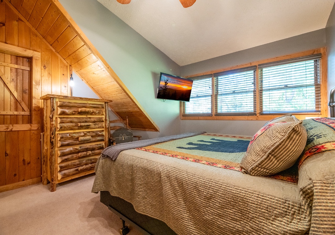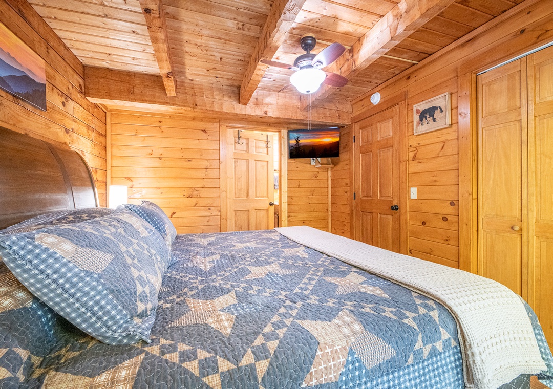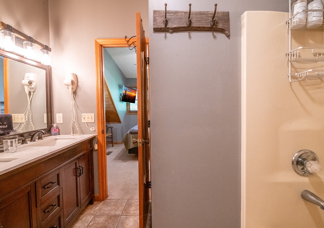 ✔ Bedroom #1 (Upper Level): Spacious Bedroom with a King-sized Bed and Flat-screen TV, Attached Full Bathroom with Shower/Tub Combo and Dual Sinks