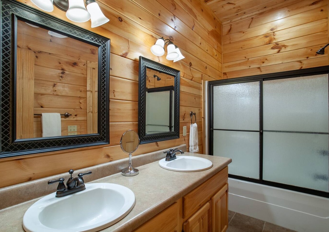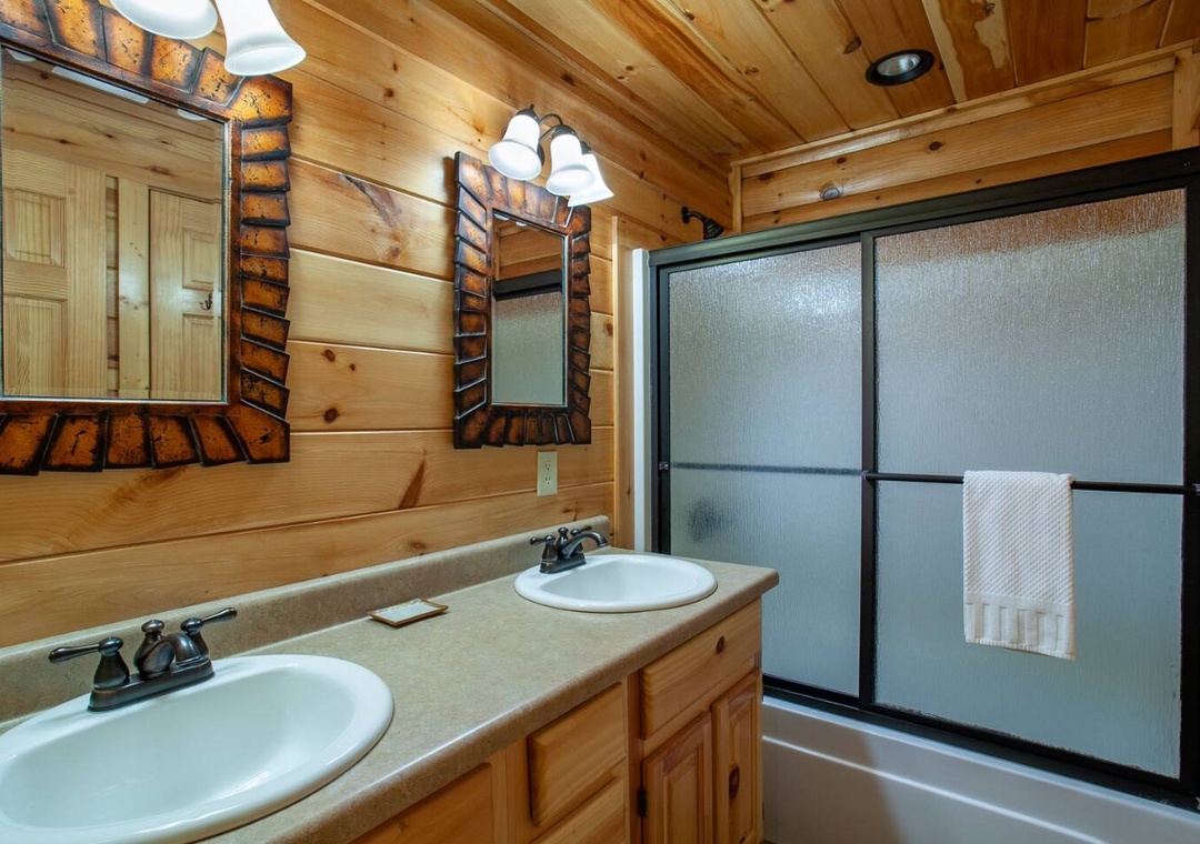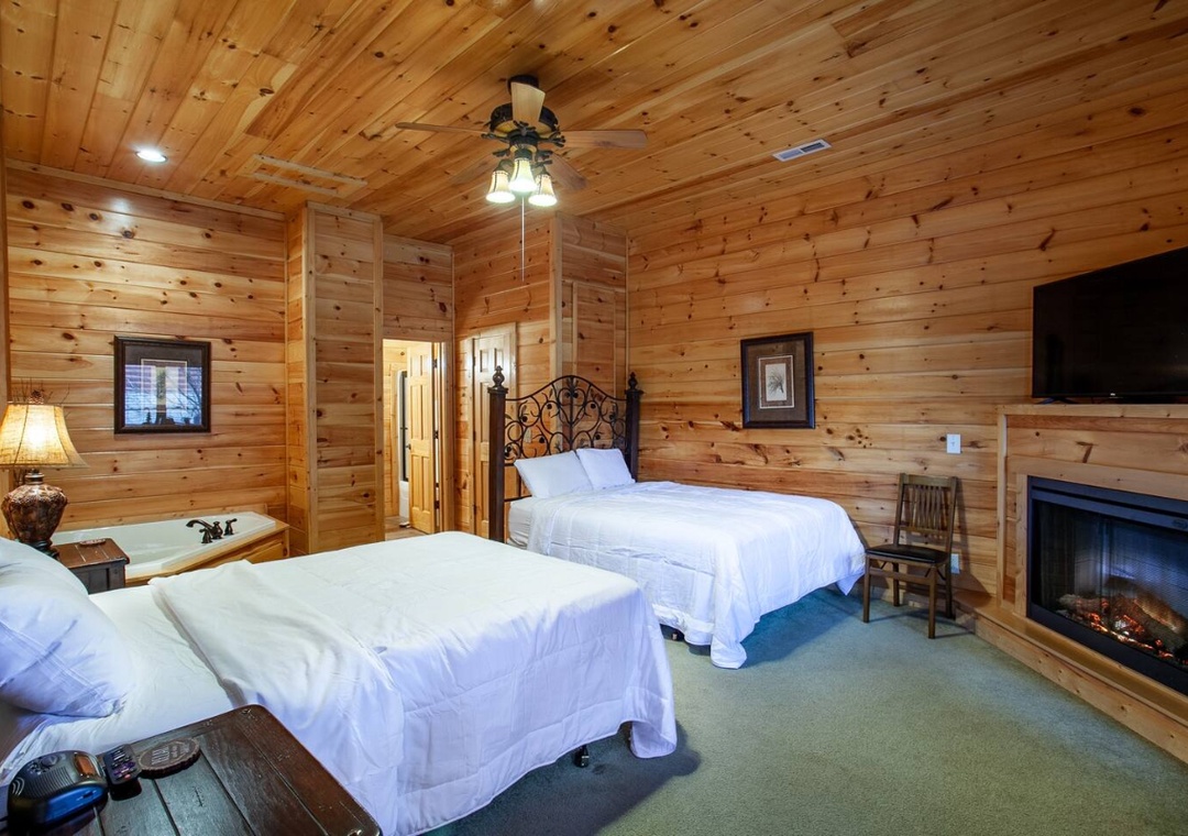 ✔ Bedroom #3 (Lower Level): Comfy bedroom with 2 Queen-sized beds; Flat-screen TV; Jacuzzi Tub; Attached full bathroom with Shower/Tub combo and dual sinks