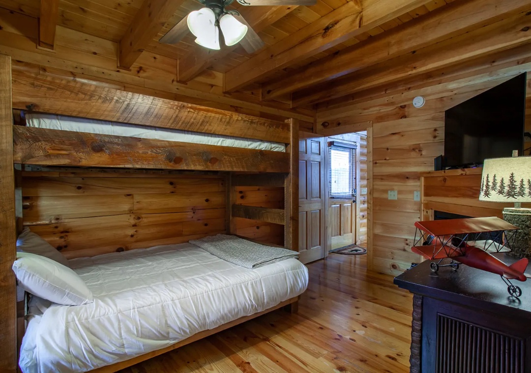 ✔ Bedroom #2 (Main Level): Comfy bedroom with Twin-over-Full Bunk Bed; Flat-screen TV; Attached full bathroom with Shower/Tub combo