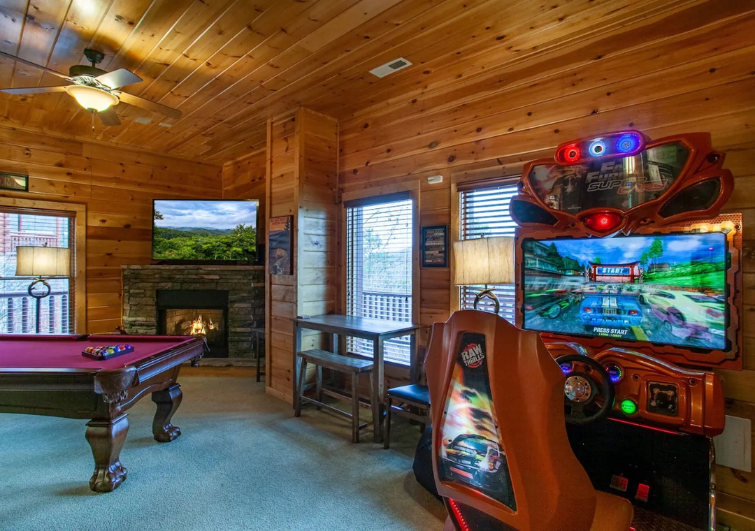 tubs in the two bedrooms and fireplaces in all three bedrooms. The game room was so much fun! My husband and grandson thoroughly enjoyed the race car game. I relived my childhood days playing Donkey Kong and Pacman.