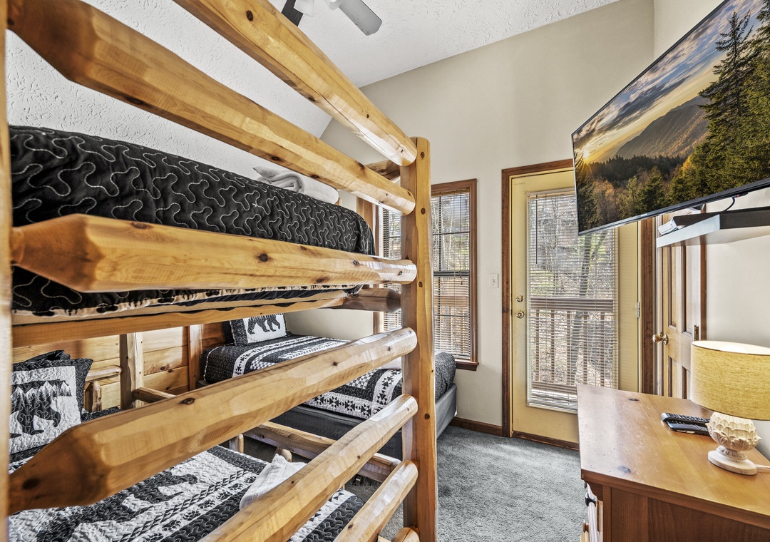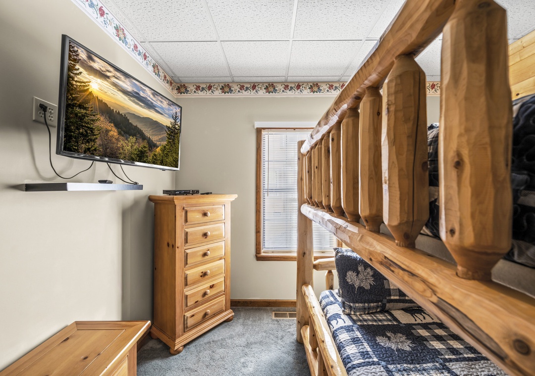 ✔ Bedroom #4 (Lower Level): Cozy bedroom with Queen-over-Queen Bunk Bed; Flat screen TV with DVD player; Access to downstairs full bathroom with Stand Up Shower