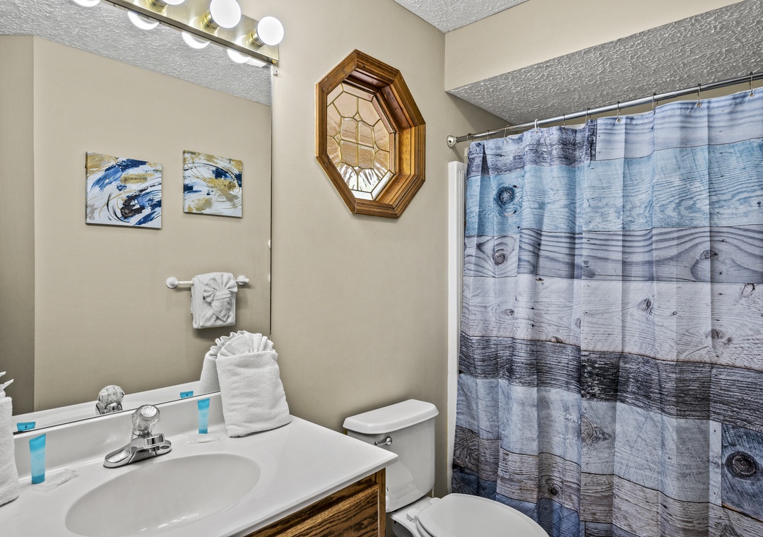 ✔ Bedroom #2 (Upper Level): Comfy bedroom with Twin-over-twin Bunk Bed and a Twin Bed; Flat screen TV with DVD player; Access to upstairs full bathroom with Stand Up Shower