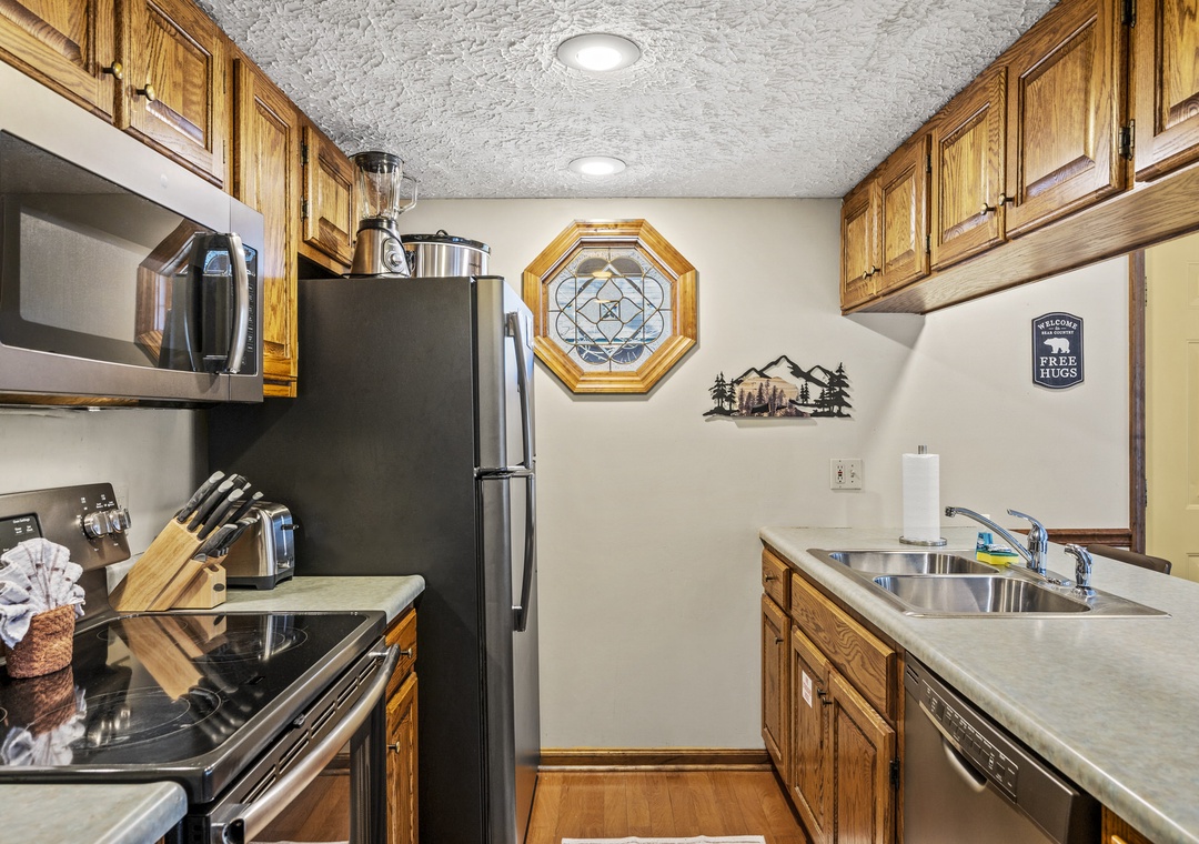 The fully equipped kitchen is a culinary haven equipped with modern appliances and ample counter space, making it a pleasure for both seasoned chefs and casual cooks alike. Complete with a full-sized refrigerator, dishwasher, stove, microwave, and other kitchen appliances perfect for making breakfast, lunch, or dinner throughout your stay! All pots, pans, glasses, plates, silverware, etc. are also there for you! Gather around the dining table for hearty breakfasts, leisurely lunches, and intimate dinners. The rustic yet elegant decor creates a cozy atmosphere, enhancing the overall dining experience.