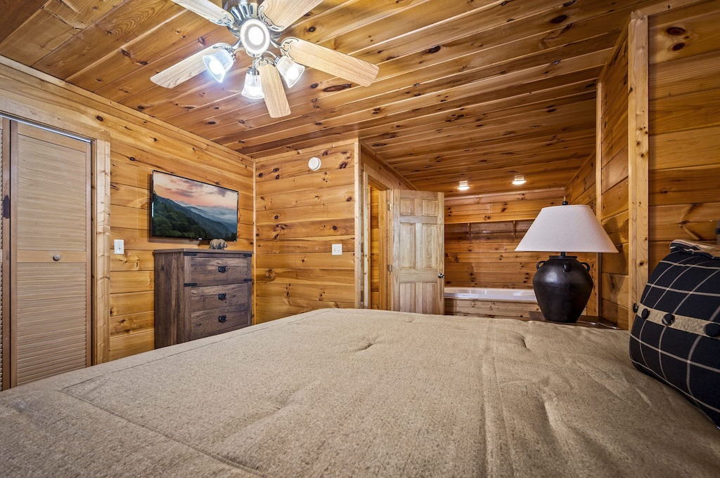 ✔ Bedroom #1 (Main Level): Spacious primary suite complete with a King-sized bed, flat screen TV, private jacuzzi tub in the bedroom, access to hall bath with walk-in shower, and private deck access to Hot Tub