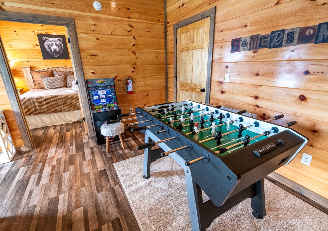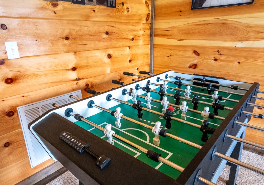 "Little Slice of Heaven" offers an array of entertainment options to ensure your getaway is as exhilarating as it is relaxing. Head downstairs to discover the ultimate gaming haven, complete with a foosball table that promises hours of friendly competition and laughter. Challenge your friends and family to a lively game of foosball, where the excitement and friendly competition are sure to create lasting memories. The game room also offers a cozy lounge area which beckons with an electric fireplace, offering a perfect spot to unwind after a day of adventure. For the ultimate relaxation, step outside onto the lower level deck, where a bubbling hot tub awaits. Let the soothing jets melt away your stress as you soak in the serene atmosphere of the Smokies. And when you're ready to explore the area, the bustling town of Sevierville awaits just a short drive away. Discover an array of entertainment options, from shopping and dining to live music and outdoor adventures, ensuring there's something for everyone to enjoy.