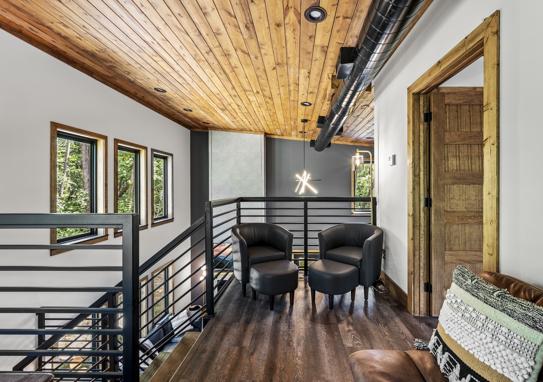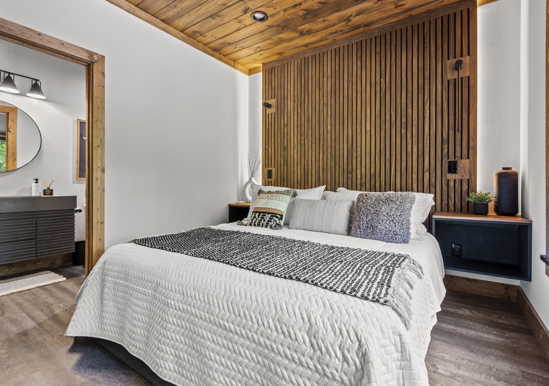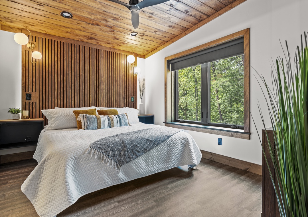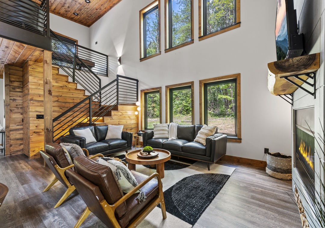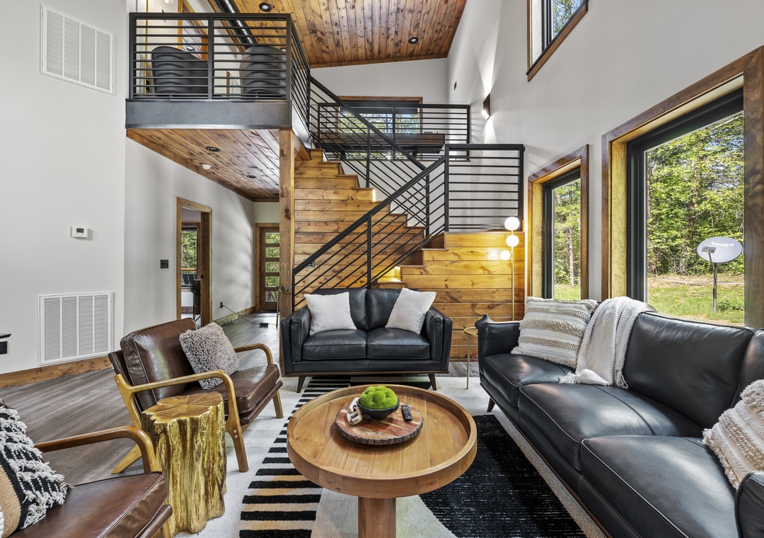 Step inside, and you'll find a warm and inviting interior that combines stylish living with modern comforts. The open-concept living area boasts high ceilings adorned with modern furnishings creating a sense of spaciousness and coziness all at once. Large windows flood the space with natural light, offering picturesque glimpses of the surrounding woods. The modern fireplace in the living room creates the perfect ambiance on chilly evenings. You’ll also find 2 spacious bedrooms that are truly havens of comfort along with modern baths; A well-equipped kitchen, ready to assist you in creating delightful meals; Free Wi-Fi.
