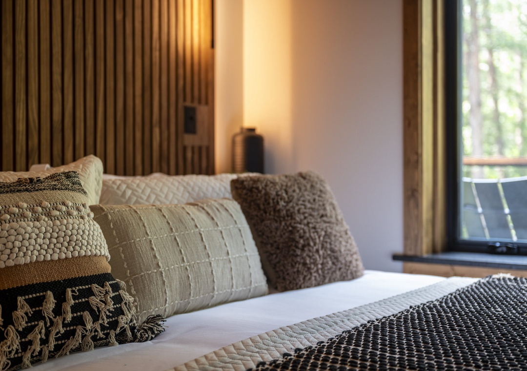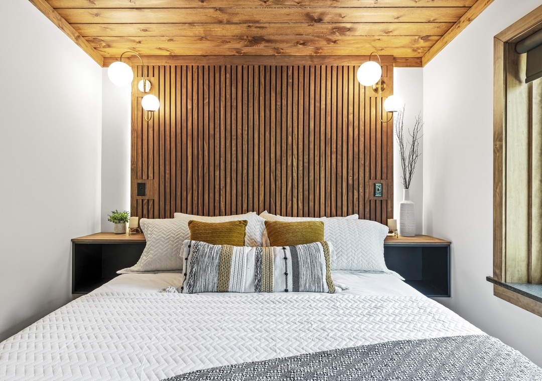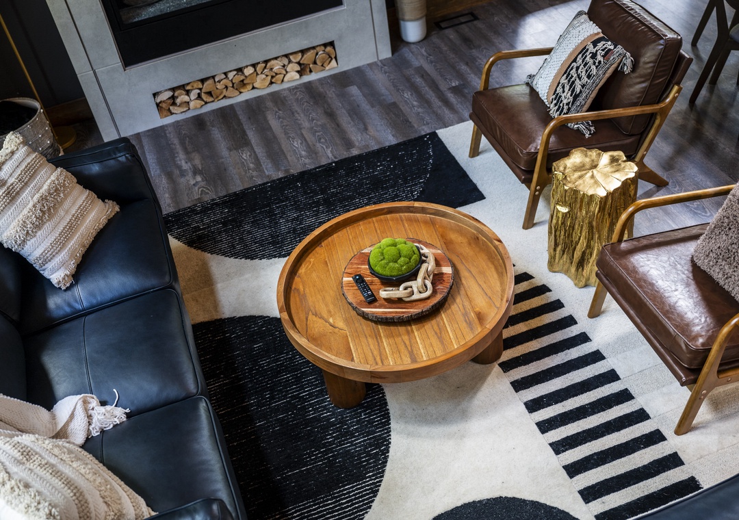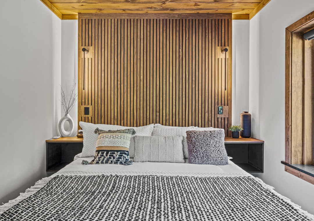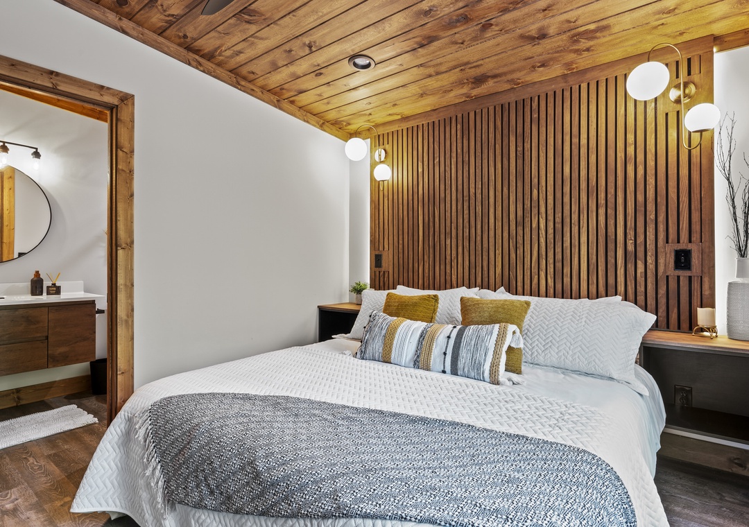 Step inside, and you'll find a warm and inviting interior that combines stylish living with modern comforts. The open-concept living area boasts high ceilings adorned with modern furnishings creating a sense of spaciousness and coziness all at once. Large windows flood the space with natural light, offering picturesque glimpses of the surrounding woods. The modern fireplace in the living room creates the perfect ambiance on chilly evenings. You’ll also find 2 spacious bedrooms that are truly havens of comfort along with modern baths; A well-equipped kitchen, ready to assist you in creating delightful meals; Free Wi-Fi.