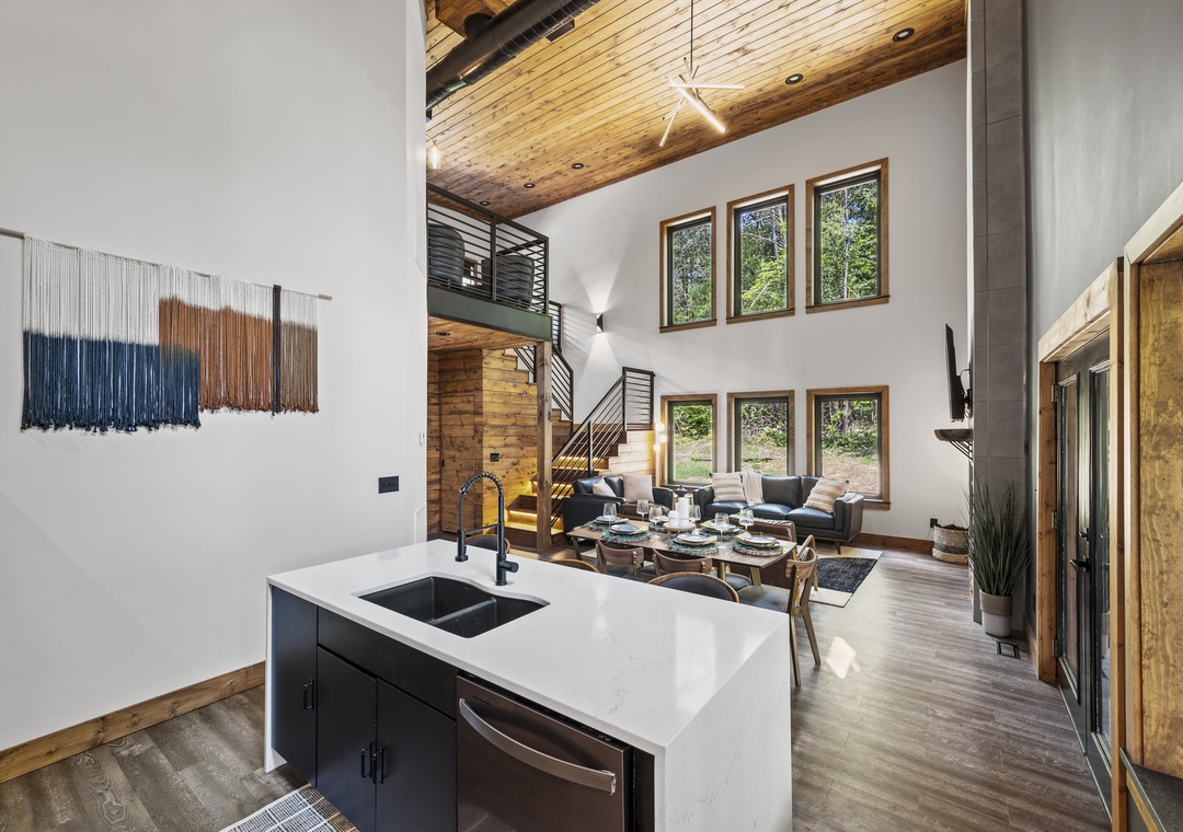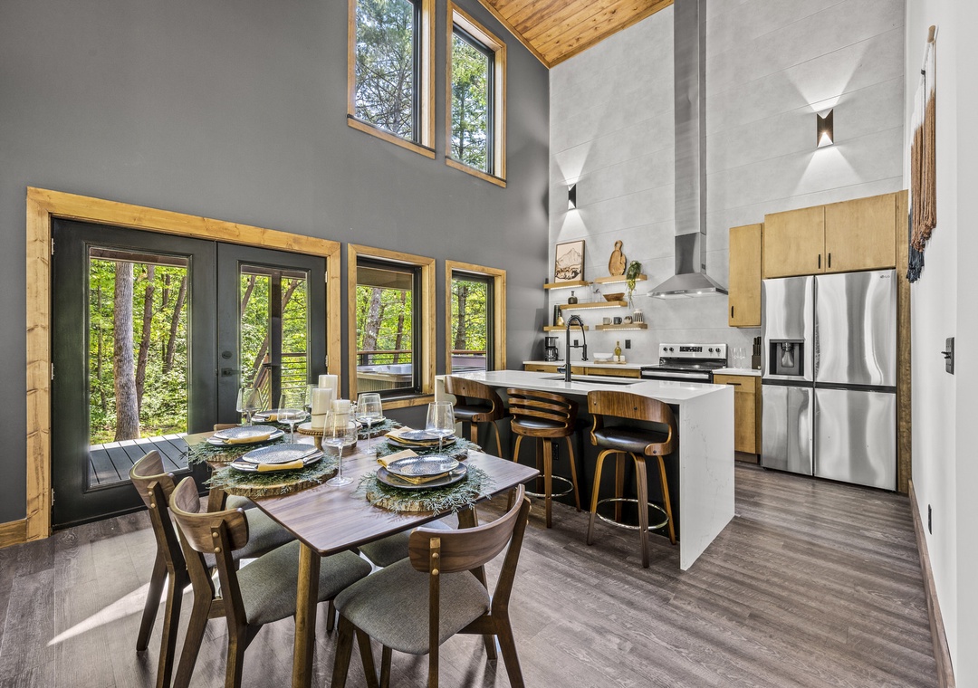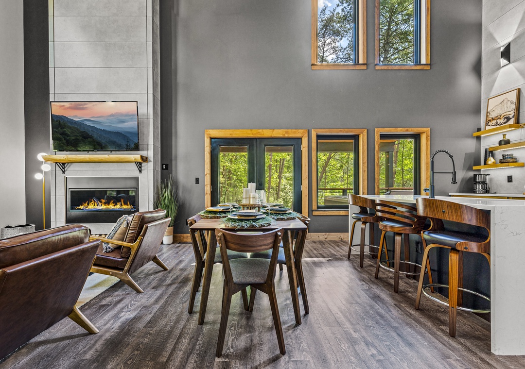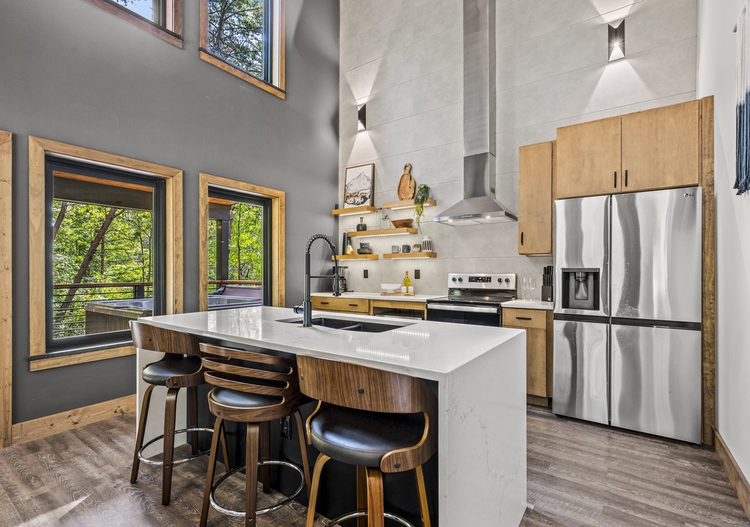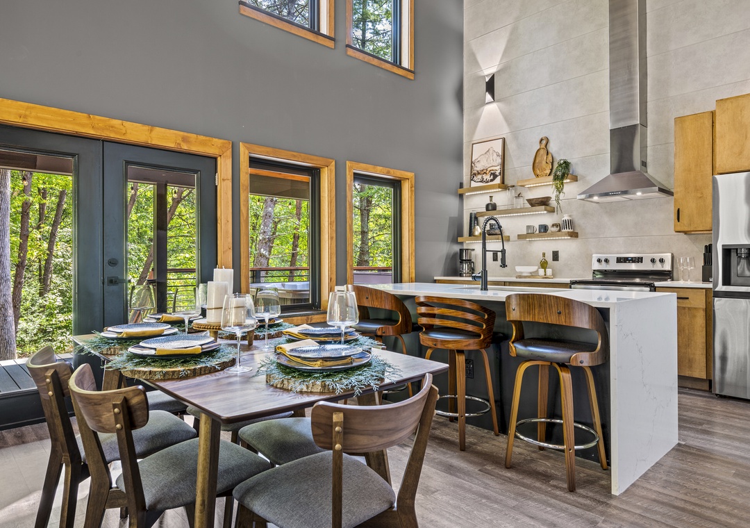 The fully-equipped kitchen is a chef's dream, with granite countertops, stainless steel appliances, and ample space for preparing delicious meals. Complete with a full-sized refrigerator, dishwasher, stove, microwave, and other kitchen appliances perfect for making breakfast, lunch, or dinner throughout your stay! All pots, pans, glasses, plates, silverware, etc. are also there for you! Share laughter and stories around the dining table and breakfast bar or you can also opt to dine al fresco on the back porch, breathing in the fresh mountain air.