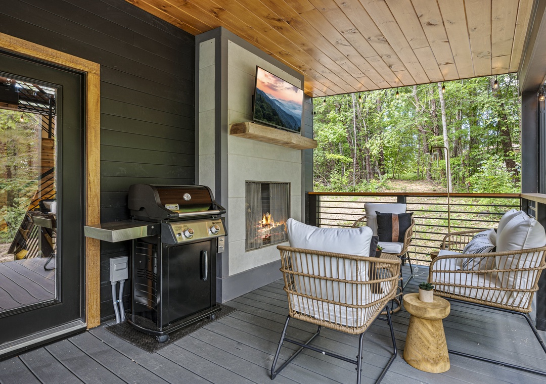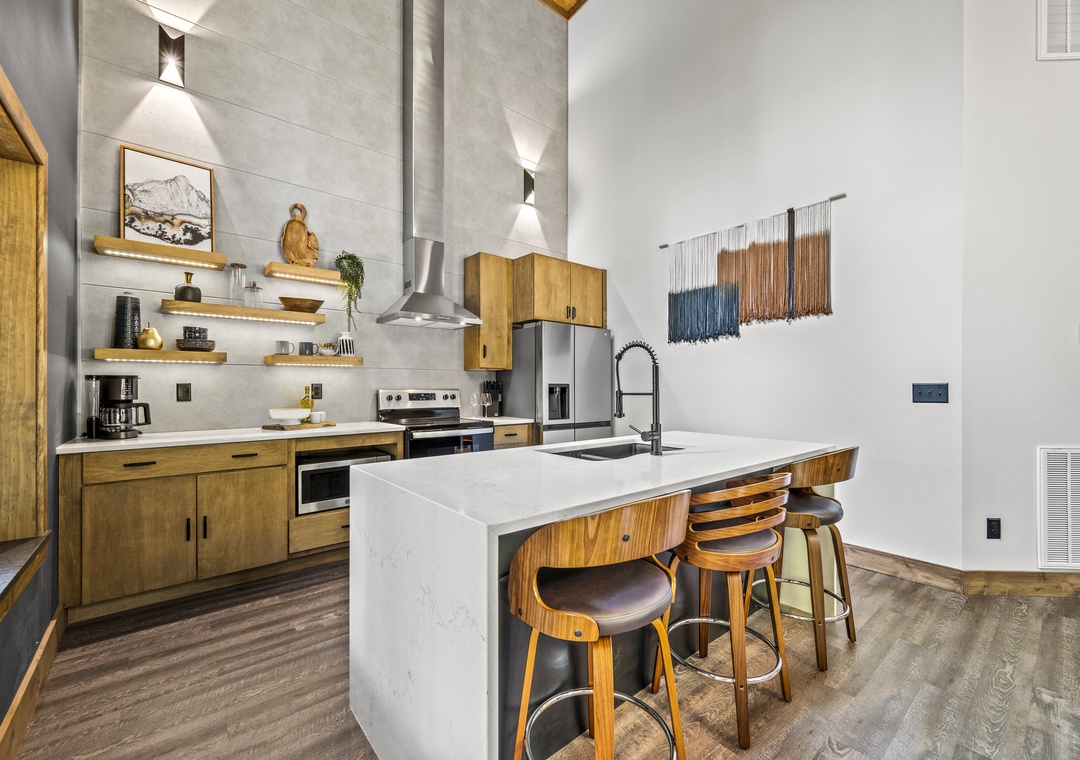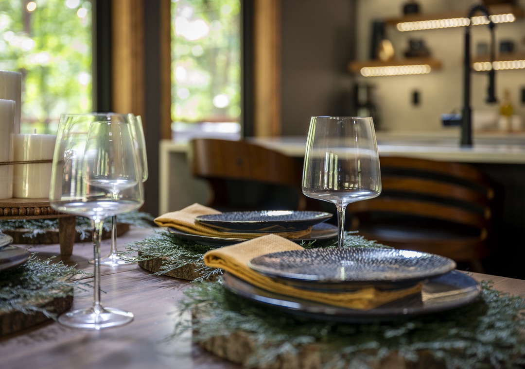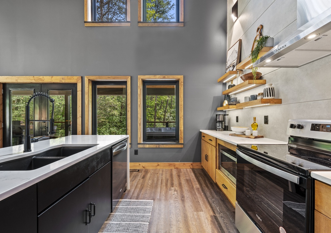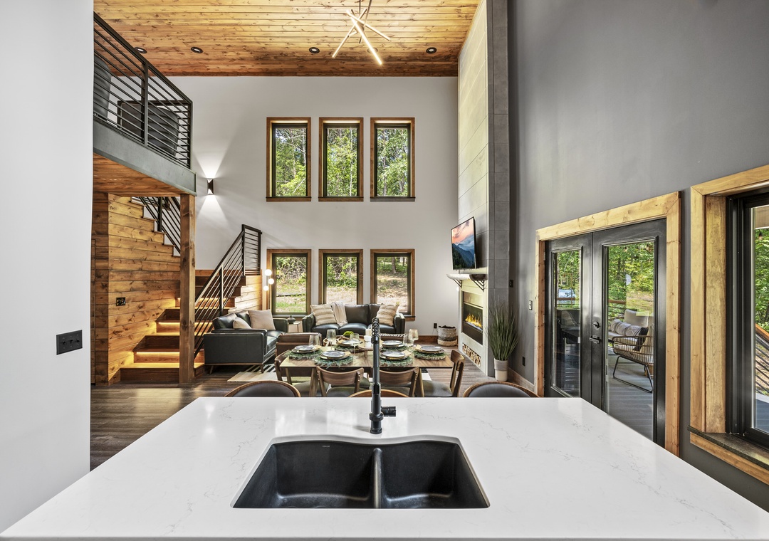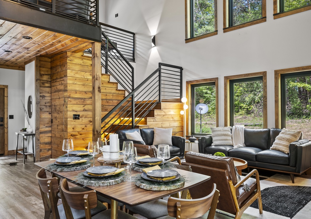 The fully-equipped kitchen is a chef's dream, with granite countertops, stainless steel appliances, and ample space for preparing delicious meals. Complete with a full-sized refrigerator, dishwasher, stove, microwave, and other kitchen appliances perfect for making breakfast, lunch, or dinner throughout your stay! All pots, pans, glasses, plates, silverware, etc. are also there for you! Share laughter and stories around the dining table and breakfast bar or you can also opt to dine al fresco on the back porch, breathing in the fresh mountain air.