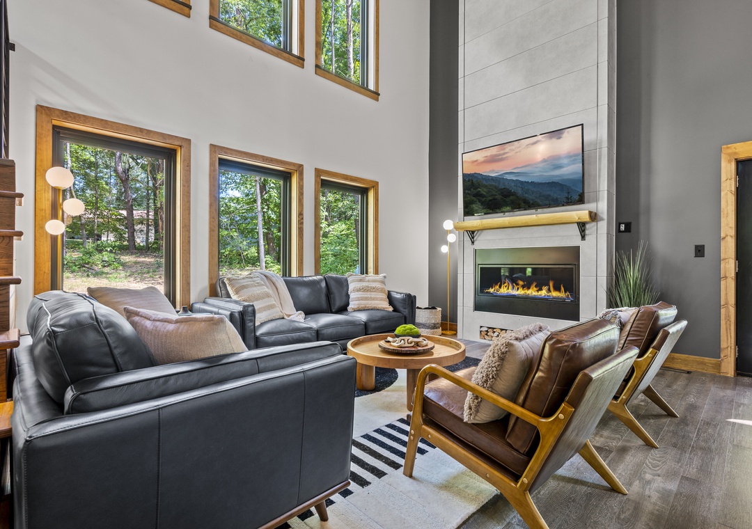 ✔ Open living area with plush seating and huge TV with sound bar and Fireplace