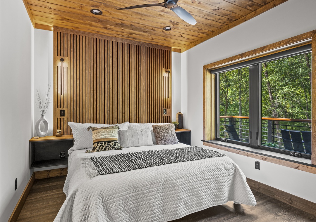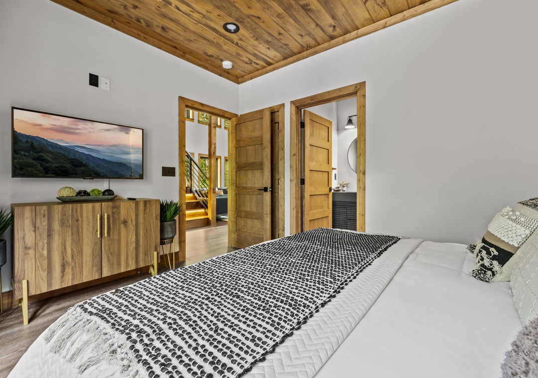 ✔ Bedroom #2(Upper Level): Spacious bedroom with a King-sized bed and large flat-screen TV; Attached full bathroom with stand-up shower